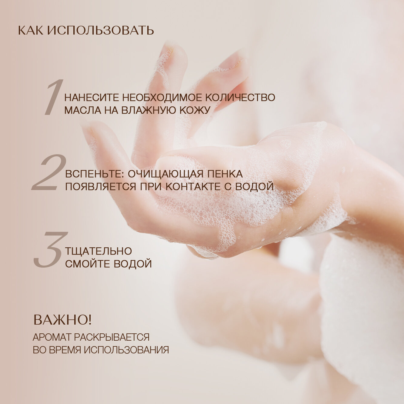 | Способ применения | Нанести масло на влажную кожу, вспенить, смыть водой. Очищающая пенка появляется при контакте с водой. |