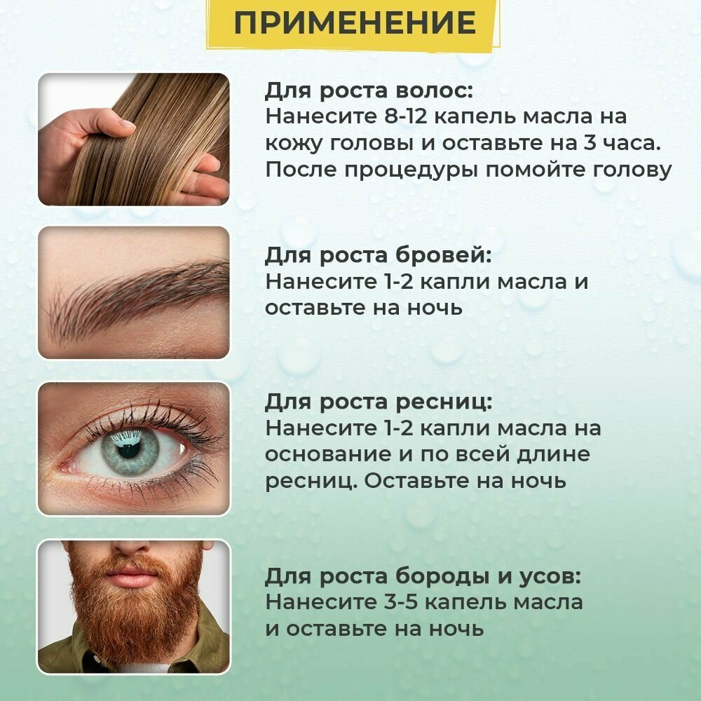 | Способ применения | Для роста и укрепления волос: нанесите 8-12 капель на кожу головы и волосы, оставьте на 2-3 часа. Затем смойте. Можно добавлять 5-6 капель в шампунь при мытье волос. Для роста и укрепления бровей: нанесите 1-2 капли, сделайте легкий массаж бровей и оставьте на ночь. Для роста и укрепления ресниц: нанесите 1 каплю масла на основание и по все длине ресниц. Оставьте на ночь. Для роста бороды и усов: нанесите 3-5 капель масла и оставьте на ночь. Так же можно применять и на день. Для ухода за кожей: нанесите масло на кожу массирующими движениями до полного впитывания. Можно добавлять в кремы. |