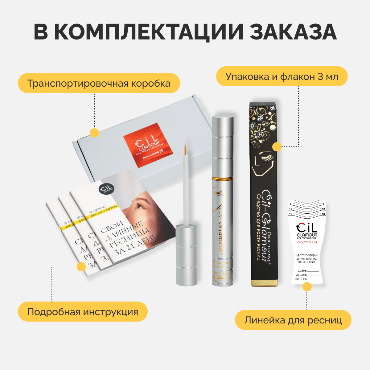 | Подробная комплектация | средство СильГламур в алюминиевом флаконе с кисточкой, подробная инструкция, линейка для ресниц |