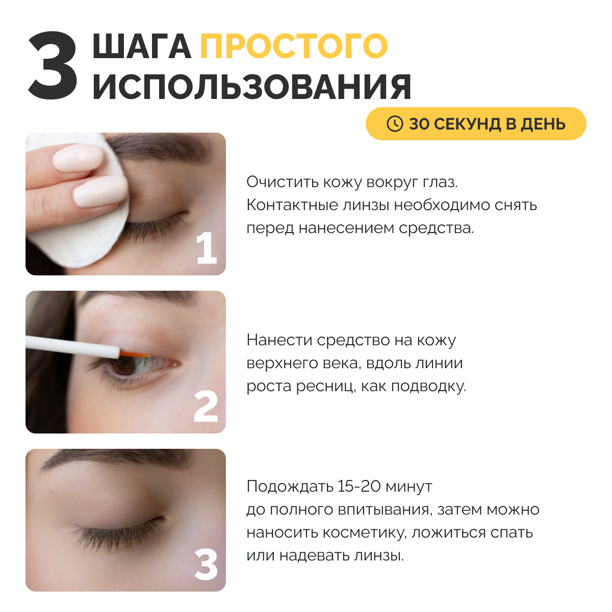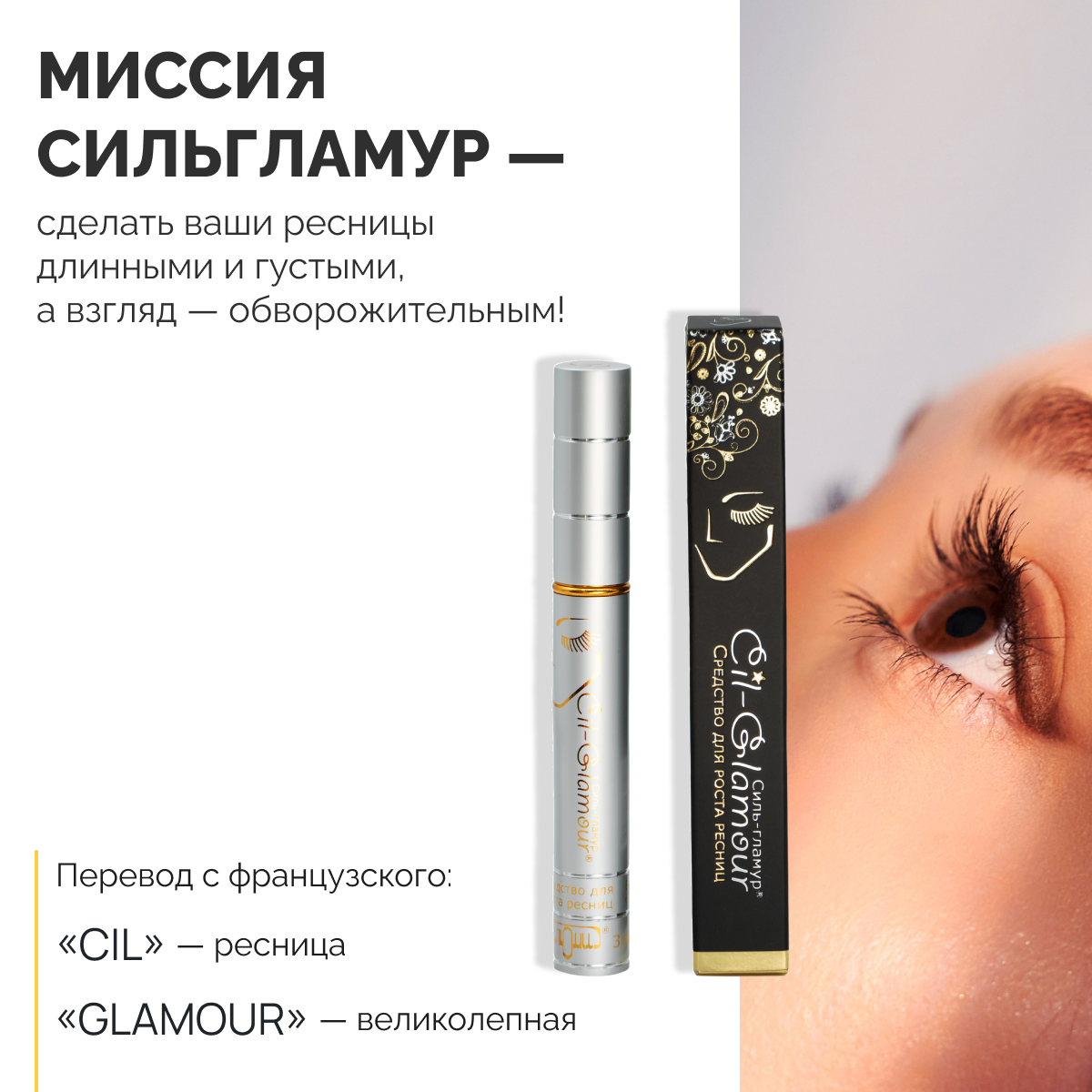 | Способ применения | 1) Тщательно очистите кожу вокруг глаз (демакияж). Если вы носите контактные линзы, снимите их перед нанесением. 2) Одним движением кисточки нанесите СильГламур на кожу верхнего века. Важно, чтобы средство ложилось точно вдоль линии роста ресниц, как подводка. 3) Подождите 15-20 минут до полного впитывания средства, прежде чем наносить косметику, ложиться спать или надевать линзы. |