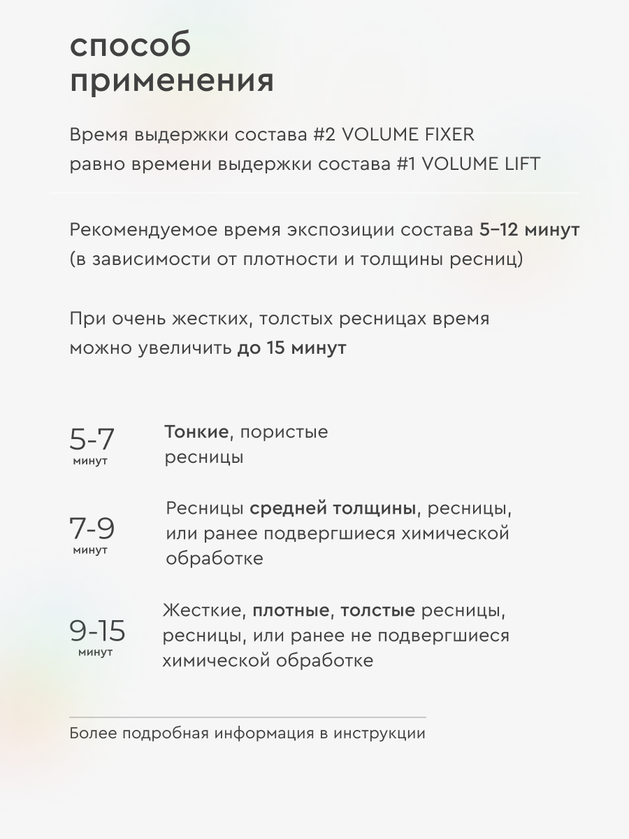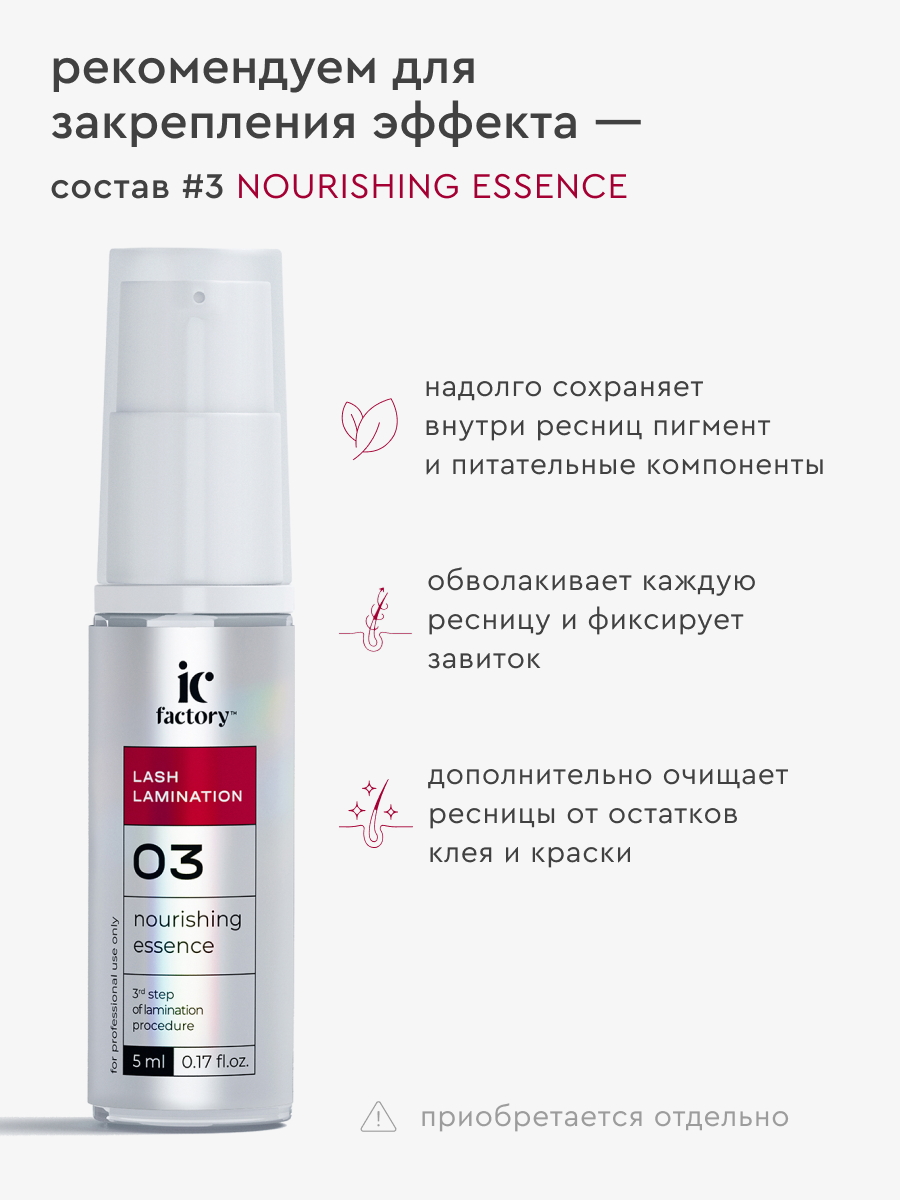 | Способ применения | Этап 1 — подготовка ресниц Этап 2 — фиксация волосков на валиках для ресниц с помощью клея и аппликатора для ламинирования Этап 3 — нанесение состава VOLUME LIFT с помощью щеточки Этап 4 — нанесение состава VOLUME FIXER с помощью щеточки Этап 5 — окрашивание ресниц краской Этап 6 — очищение ресниц профессиональным составом EYELASH CLEANSER Этап 7 — нанесение состава NOURISHING ESSENCE Более подробная информация о каждом этапе ламинирования в инструкции. В официальном магазине INNOVATOR COSMETICS вы также найдете средства для укладки бровей: гели для бровей и составы для долговременной укладки бровей. |