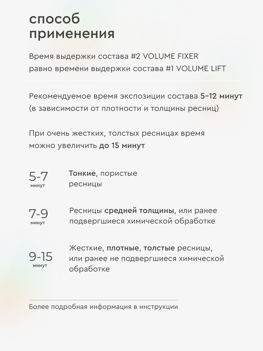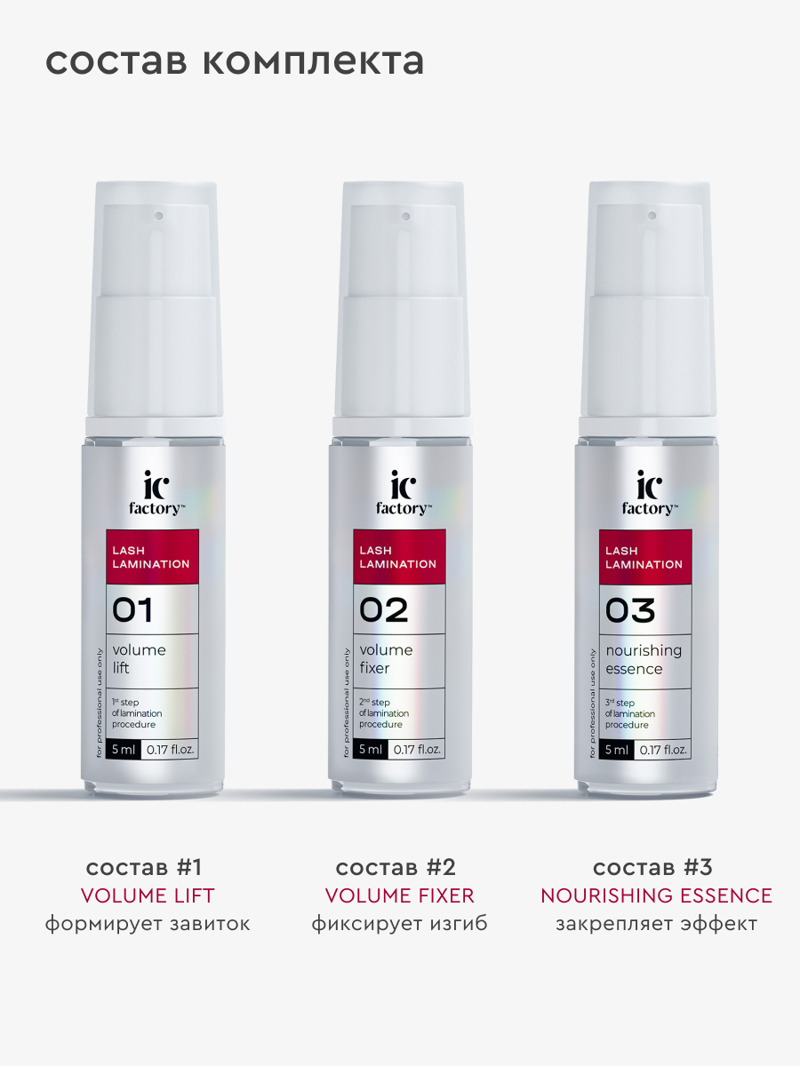 | Способ применения | Этап 1 — подготовка ресниц Этап 2 — фиксация волосков на валиках для ресниц с помощью клея и аппликатора для ламинирования Этап 3 — нанесение состава VOLUME LIFT с помощью щеточки Этап 4 — нанесение состава VOLUME FIXER с помощью щеточки Этап 5 — окрашивание ресниц краской Этап 6 — очищение ресниц профессиональным составом EYELASH CLEANSER Этап 7 — нанесение состава NOURISHING ESSENCE Более подробная информация о каждом этапе ламинирования в инструкции. В официальном магазине INNOVATOR COSMETICS вы также найдете средства для укладки бровей: гели для бровей и составы для долговременной укладки бровей. |