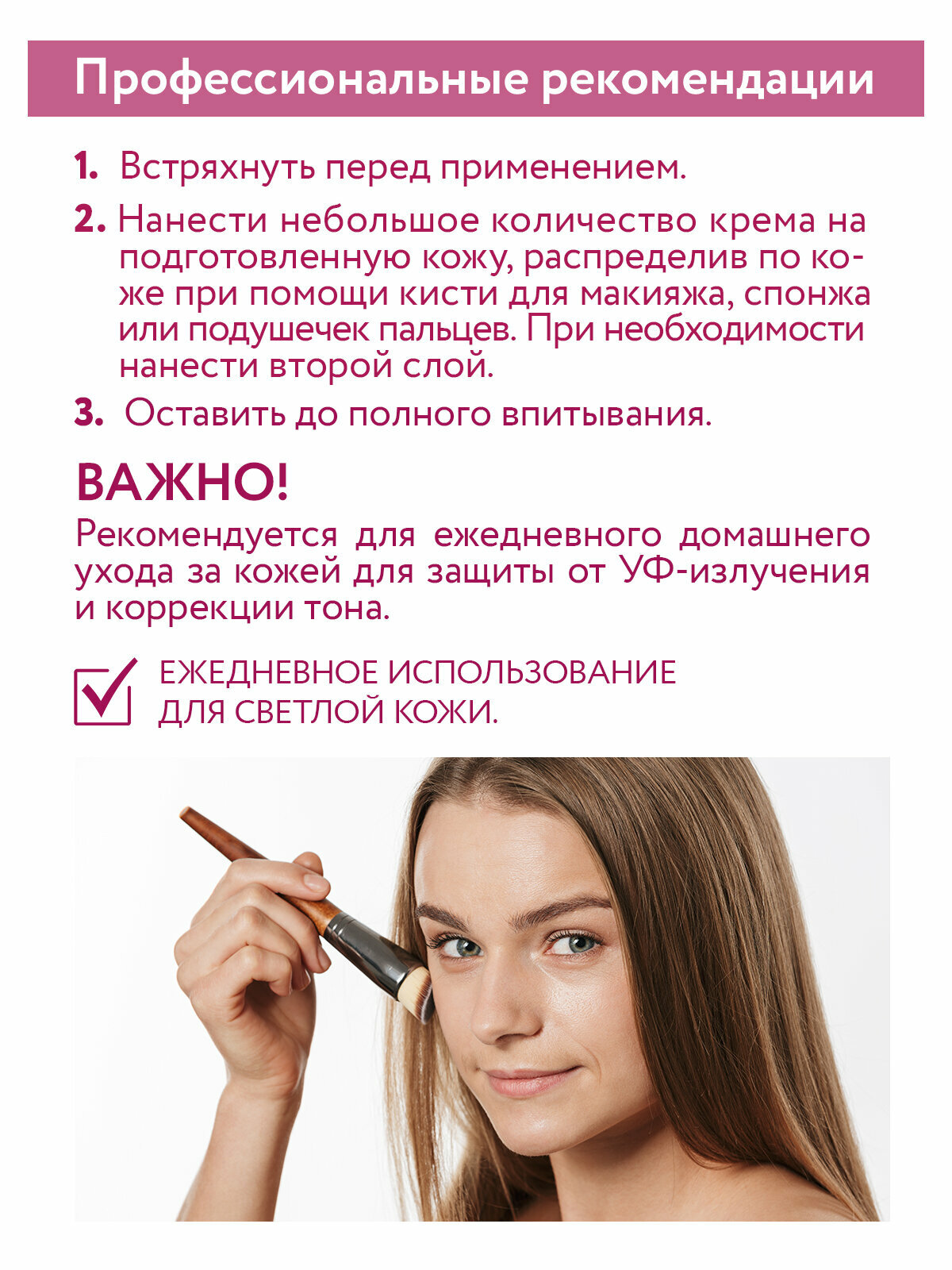 | Способ применения | встряхнуть перед применением, нанести небольшое количество крема на кожу, распределить тонкой вуалью по коже при помощи кисти для макияжа, спонжа или подушечек пальцев. При необходимости нанести второй слой. |