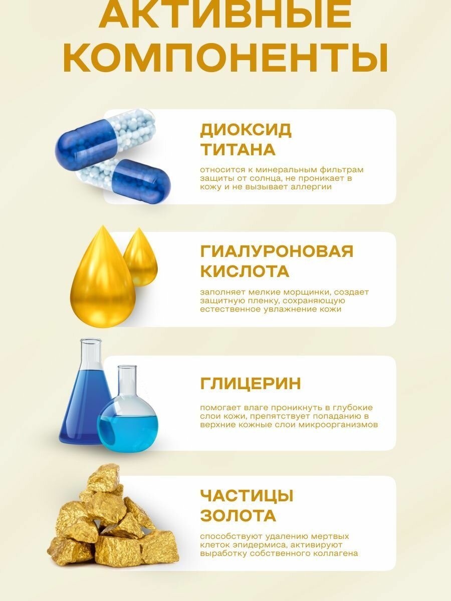 | Состав | water, cyclopentasiloxane, titanium dioxide, cyclohexasiloxane, ethylhexyl methoxycinnamate, caprylic/capric triglyceride, glyserin, zinc oxide, cyclomethicone, dimethicone, butylene glycol, arbutin, cetyl peg/ppg-10/1 dimethicone, sorbitan sesquioleate, 4-methylbenzylidene camphor, iron oxide yellow, ozokerite, sodium chloride, peg-10 dimethicone, dimethicone/vinyl dimethicone crosspolymer, sodium hyaluronate, magnesium aluminum silicate, phenoxyethanol, iron oxide black, iron oxide red, methicone, triethoxycaprylylsilane, flavor, beta-glucan, hydrolyzed collagen, adenosine, centella asiatica extract, gold (1ppm) |