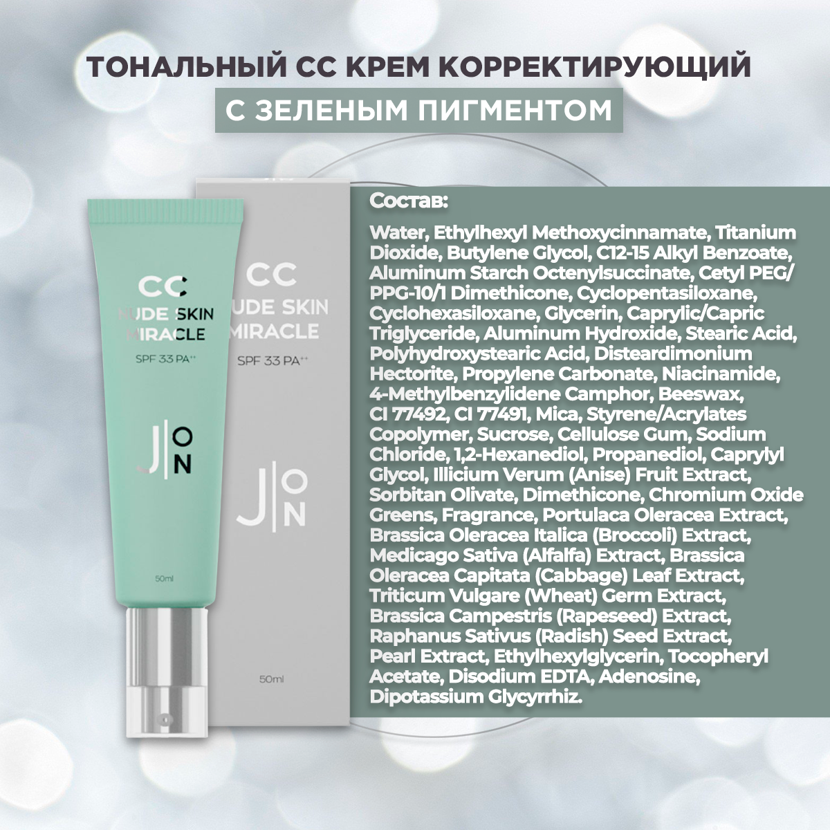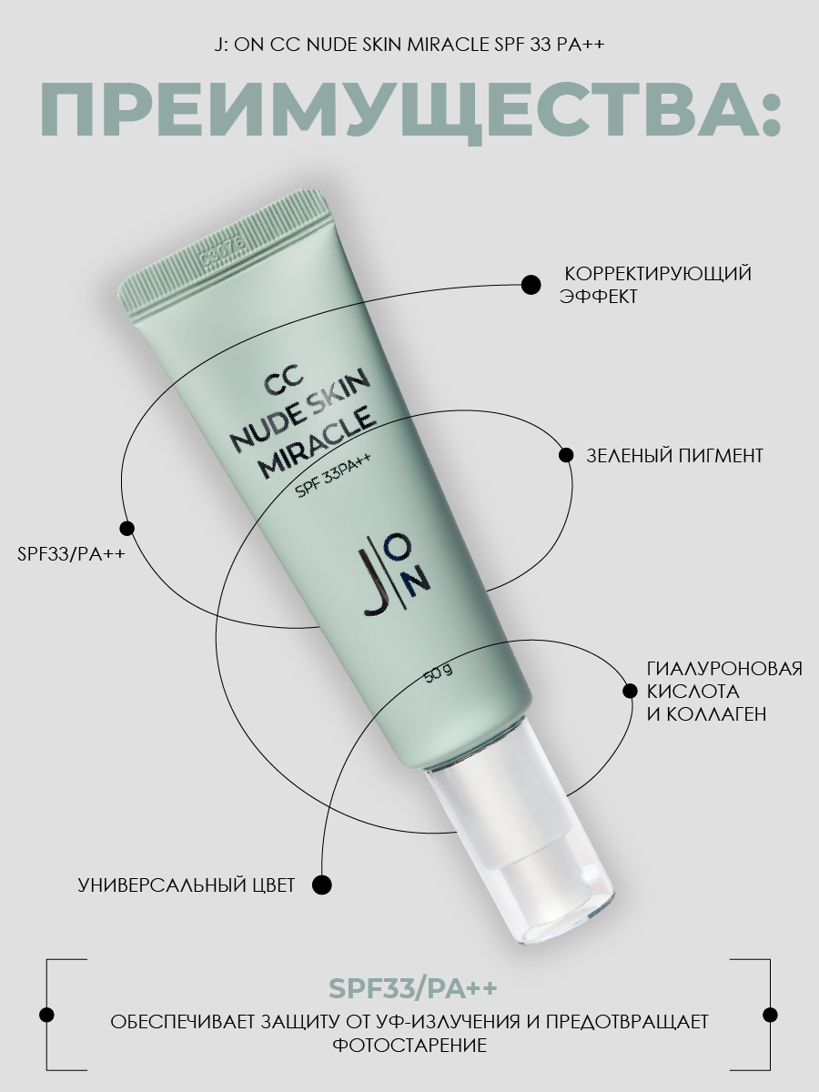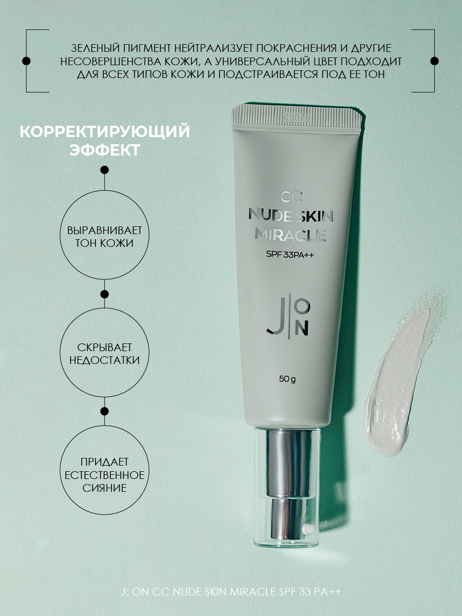 Тональный СС крем корректирующий с зеленым пигментом J:ON CC nude skin miracle с SPF33 50 мл Корея интересное: