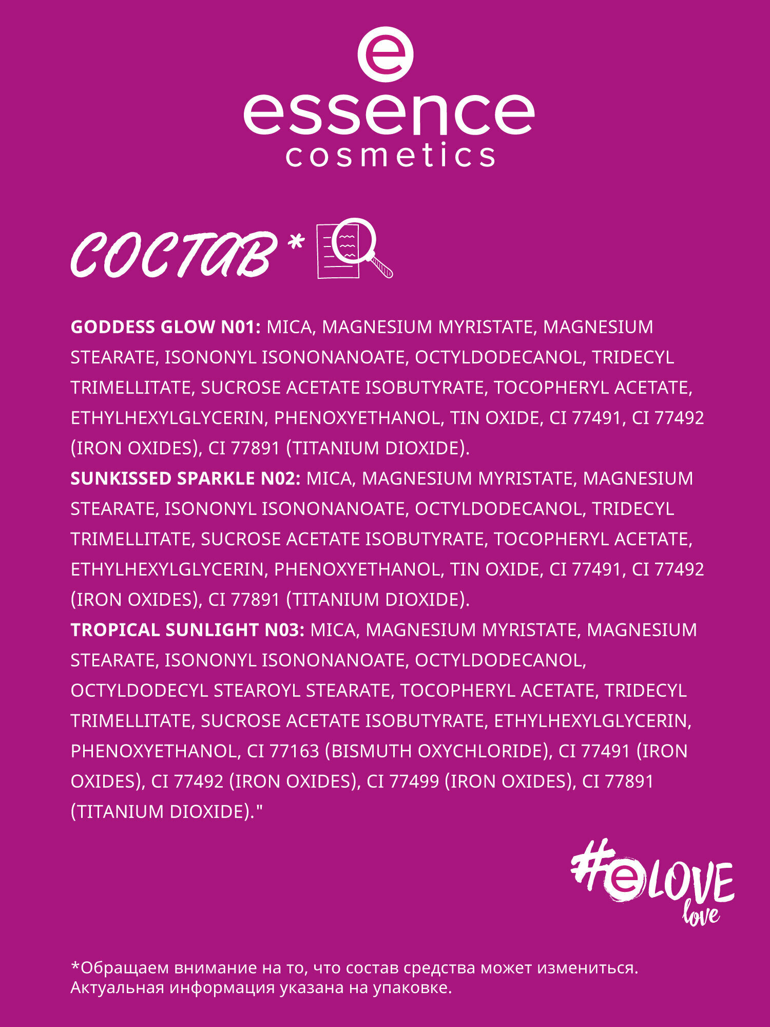 | Состав | INGREDIENTS: (GODDESS GLOW N01) MICA, MAGNESIUM MYRISTATE, MAGNESIUM STEARATE, ISONONYL ISONONANOATE, OCTYLDODECANOL, TRIDECYL TRIMELLITATE, SUCROSE ACETATE ISOBUTYRATE, TOCOPHERYL ACETATE, ETHYLHEXYLGLYCERIN, PHENOXYETHANOL, TIN OXIDE, CI 77491, CI 77492 (IRON OXIDES), CI 77891 (TITANIUM DIOXIDE). INGREDIENTS: (SUNKISSED SPARKLE N02) MICA, MAGNESIUM MYRISTATE, MAGNESIUM STEARATE, ISONONYL ISONONANOATE, OCTYLDODECANOL, TRIDECYL TRIMELLITATE, SUCROSE ACETATE ISOBUTYRATE, TOCOPHERYL ACETATE, ETHYLHEXYLGLYCERIN, PHENOXYETHANOL, TIN OXIDE, CI 77491, CI 77492 (IRON OXIDES), CI 77891 (TITANIUM DIOXIDE). INGREDIENTS: (TROPICAL SUNLIGHT N03) MICA, MAGNESIUM MYRISTATE, MAGNESIUM STEARATE, ISONONYL ISONONANOATE, OCTYLDODECANOL, OCTYLDODECYL STEAROYL STEARATE, TOCOPHERYL ACETATE, TRIDECYL TRIMELLITATE, SUCROSE ACETATE ISOBUTYRATE, ETHYLHEXYLGLYCERIN, PHENOXYETHANOL, CI 77163 (BISMUTH OXYCHLORIDE), CI 77491 (IRON OXIDES), CI 77492 (IRON OXIDES), CI 77499 (IRON OXIDES), CI 77891 (TITANIUM DIOXIDE). |