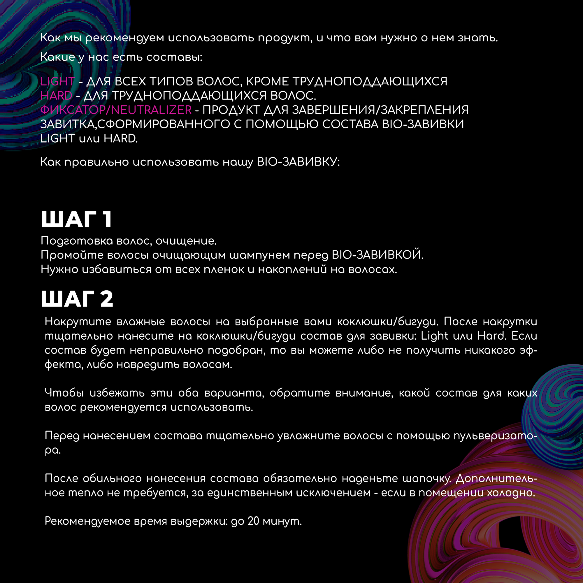 | Дополнительная информация | BIO-Завивка Light, Hard и Neutralizer/Фиксатор являются полноценными готовыми к использованию продуктами и НЕ ТРЕБУЮТ добавления воды (разбавления водой). |