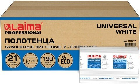 Купить Полотенца бумажные 190 шт., Laima (Система H2) Universal White, 1-слойные, белые, Комплект 21 пачка, 22,5х20,5 см, Z-сложения, 112517