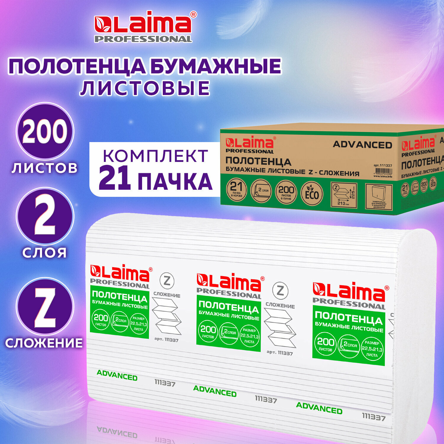 Полотенца бумажные 200 шт., Laima (H2) Advanced, 2-слойные, белые, Комплект 21 пачка, 22,5х21,3, Z-сложение, 111337