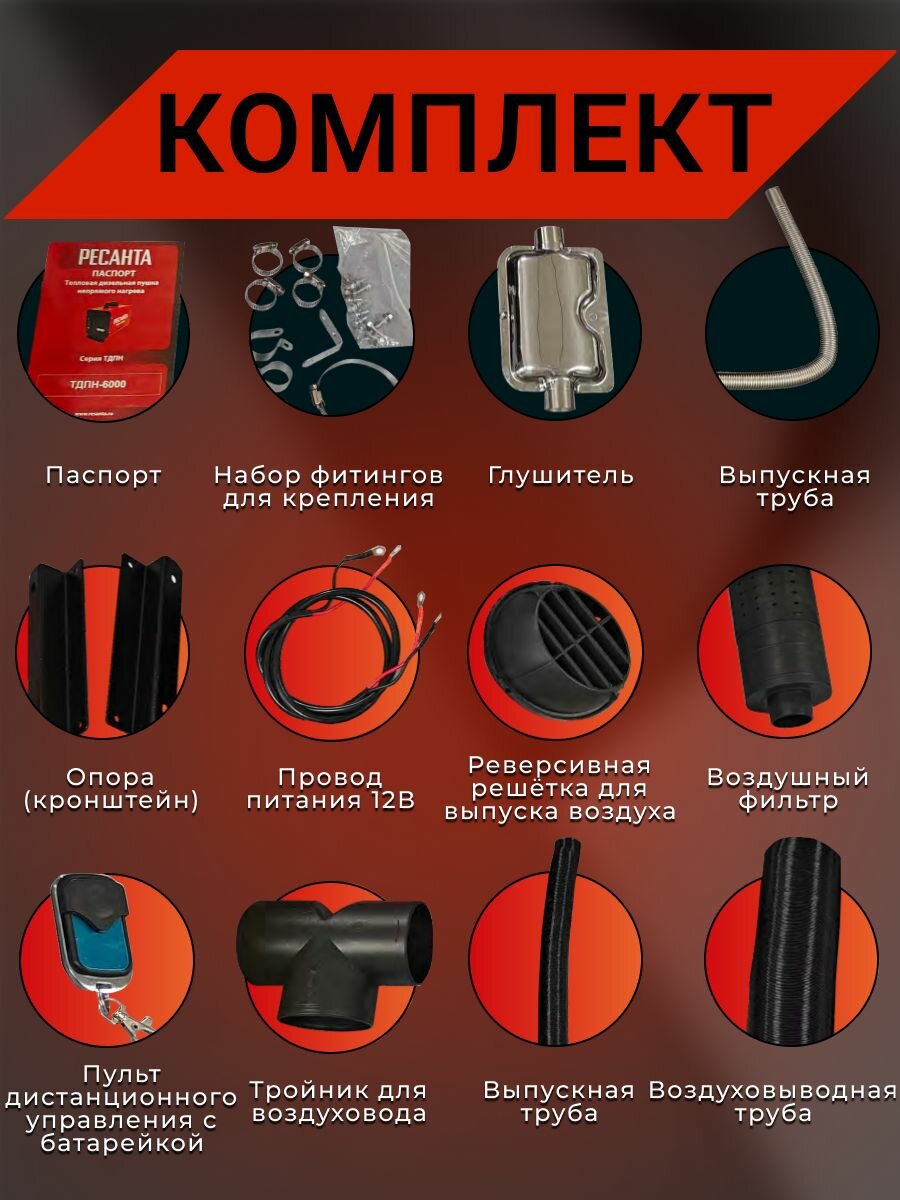 | Подробная комплектация | Тепловая дизельная пушка Пульт дистанционного управления с батарейкой Провод питания 12В Опора (кронштейн) 2 шт. Набор фитингов для крепления Паспорт Упаковка |