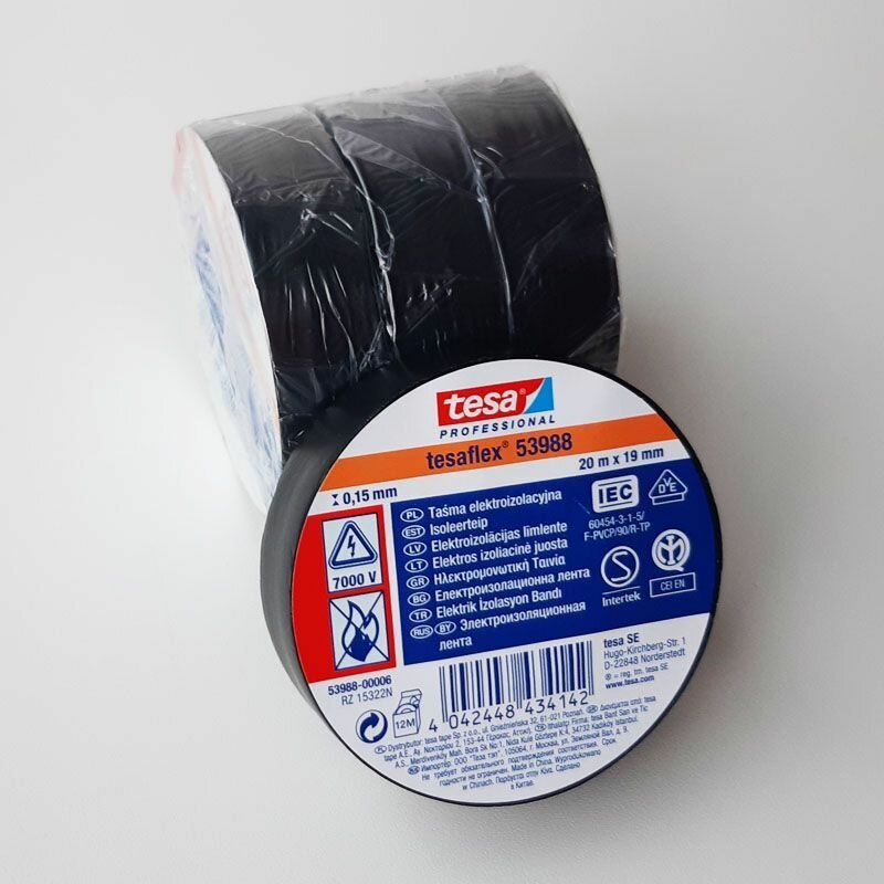 Tesa 53988 ПВХ * 3шт по 20метров х 19мм * Изолента пфх термостойкая черная, теса