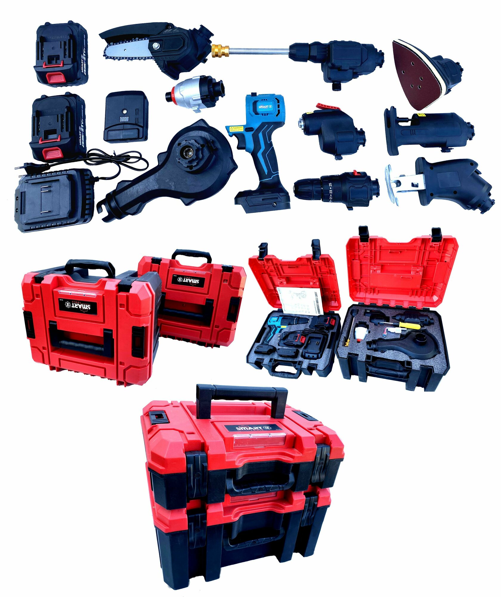 | Инструмент в наборе | дельташлифмашина / дрель-шуруповерт / лобзик / многофункциональный инстумент / сабельная пила / угловая шлифмашина / фонарь / шуруповерт |