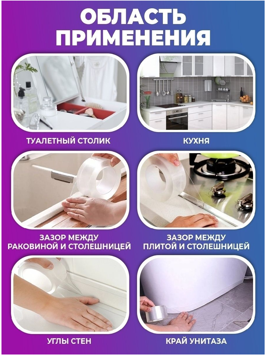 Купить Защитная бордюрная лента для ванны, кухни, раковины, плиты. Прозрачная самоклеящаяся водостойкая клейкая лента длина 3 м. ширина 3 см.