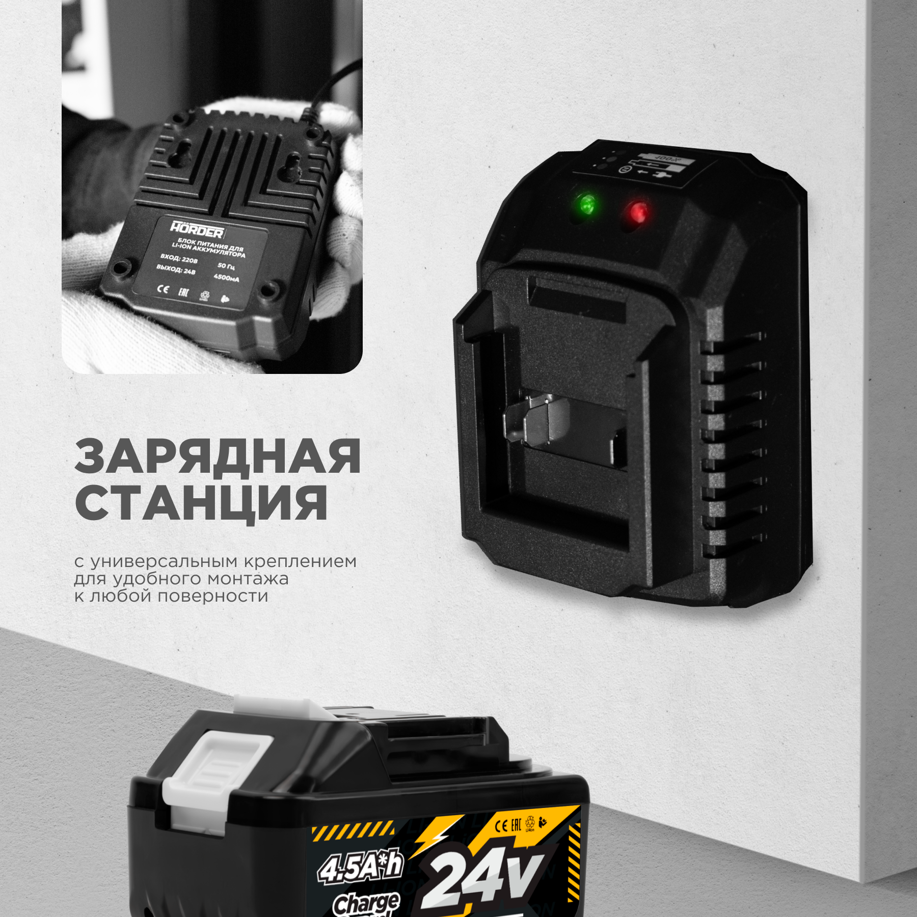 Гайковерт аккумуляторный HORDER HW-1100 Li1 ECO бесщеточный ударный, 24 В 4.5 Ач, 1100 Нм, 5000 об/мин 3 скорости, головки, подвесная ручка + ремень, перчатки