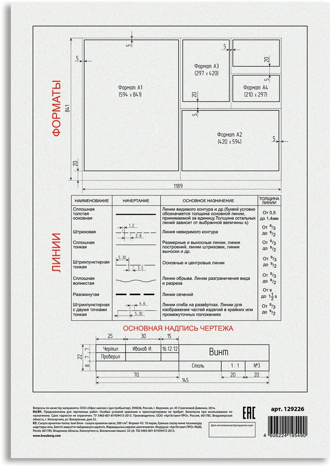 Бумага/папка/листы для черчения большого формата (297х420 мм) А3, 24 л., 200 г/м2, без рамки, ватман гознак КБФ, Brauberg, 129254
