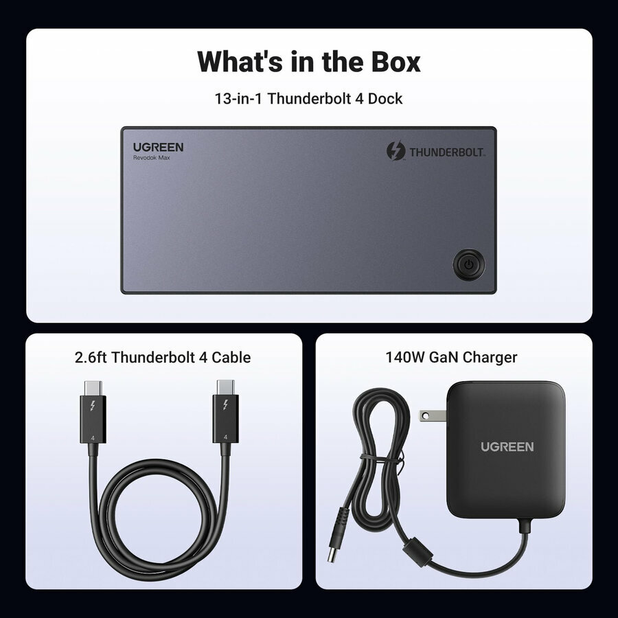 | Комплектация | Док-станция UGREEN Revodok Max 213, 180W GaN блок питания и кабель, кабель Thunderbolt 4 длиной 0.8 м, документация |