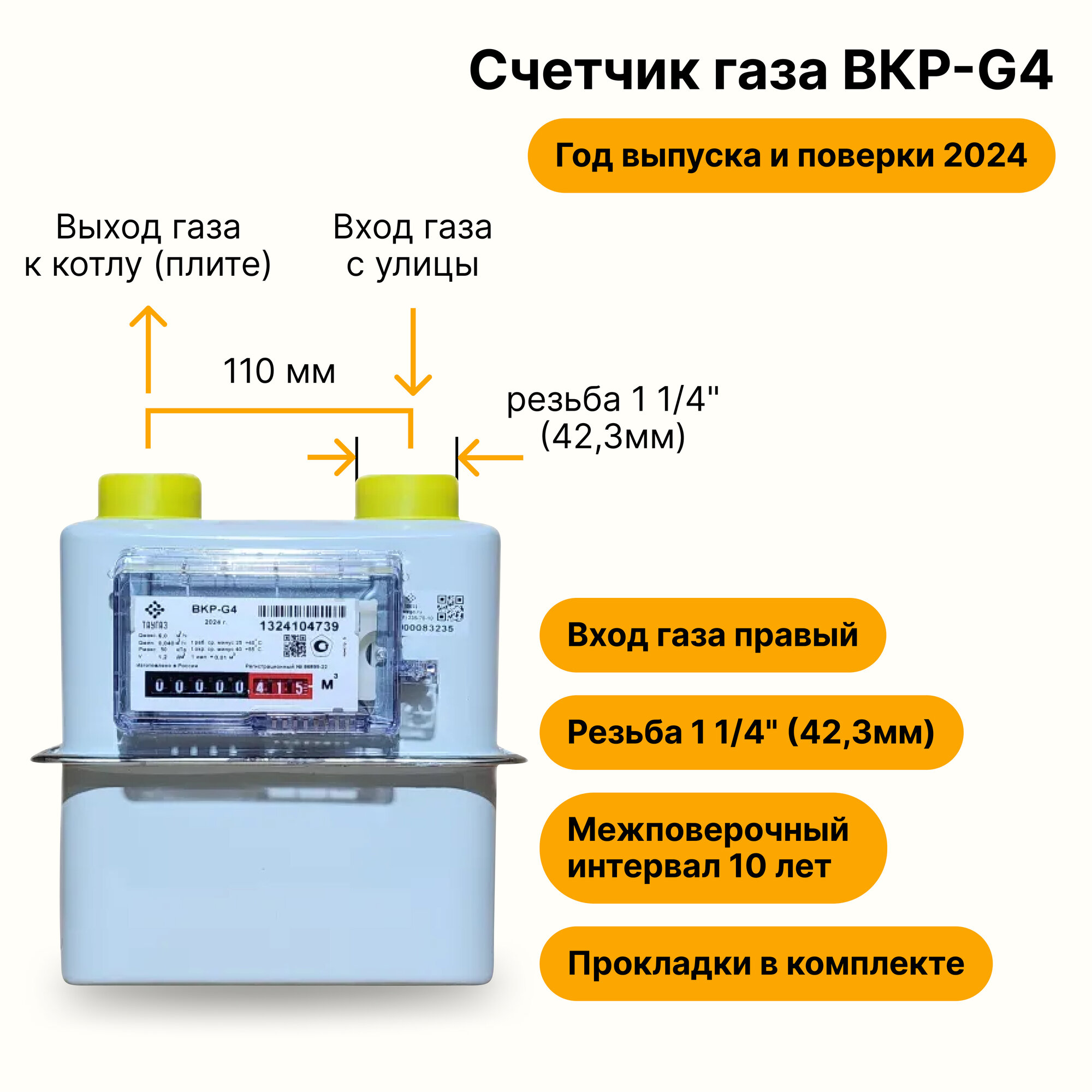 Счетчик газа BKР-G4 таугаз (вход газа правый, резьба 1 1/4", как ВК-G4, прокладки В комплекте) 2024 года выпуска и поверки интересное: