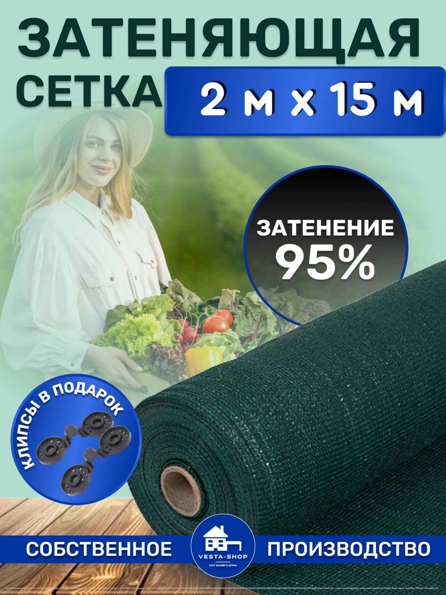 Сетка затеняющая зеленая, затенение 95%, размер 2х16м клипсы в комплекте