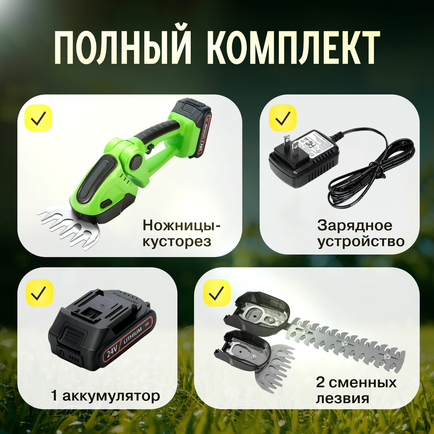 | Подробная комплектация | Триммер-кусторез в сборе: Зарядное устройство: Аккумулятор: Лезвие для работы в режиме кустореза 30 см; Лезвие для работы в режиме стрижки газона 10 см/ |