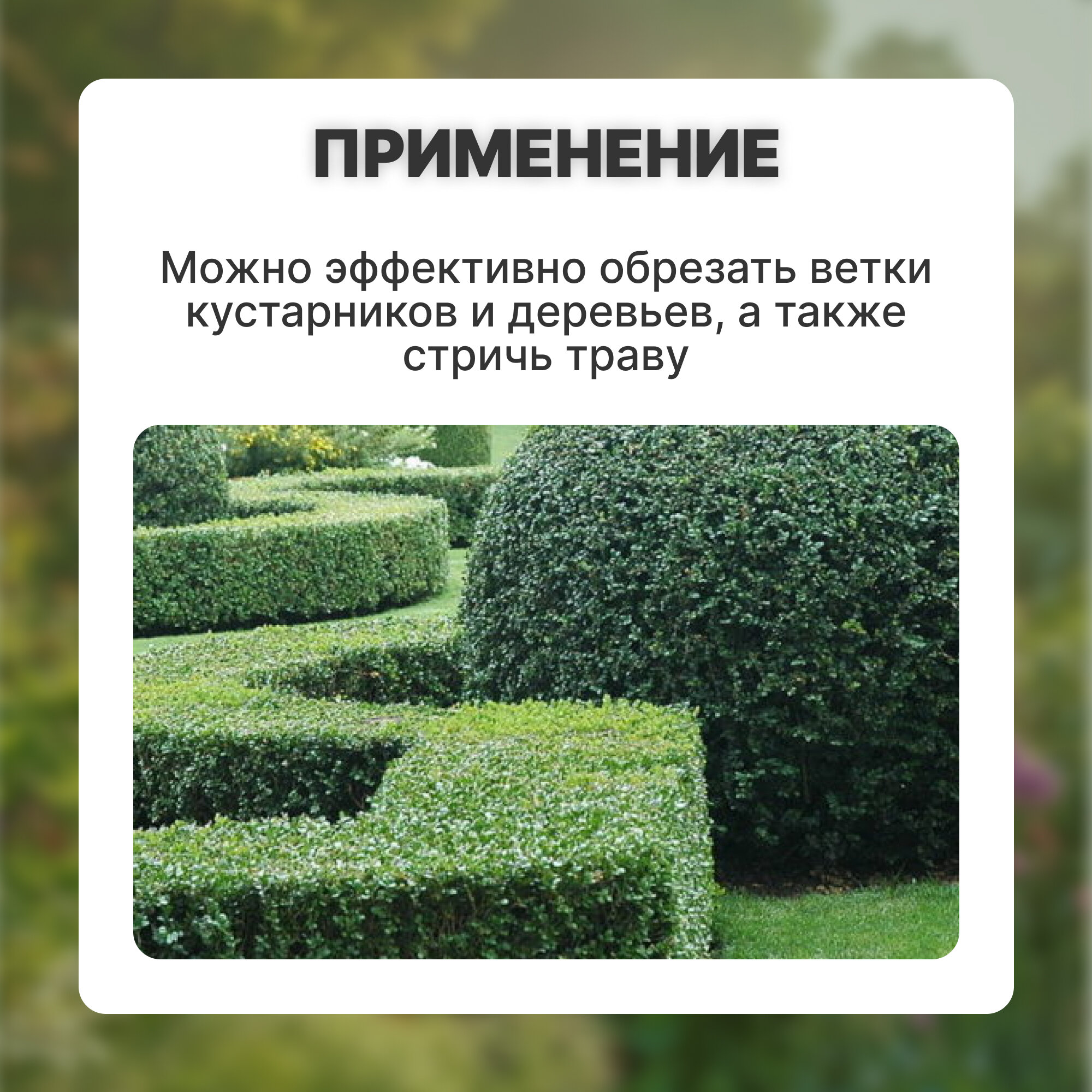 | Подробная комплектация | Кусторез, аккумуляторы, кейс, зарядное устройство, инструкция, упаковка |