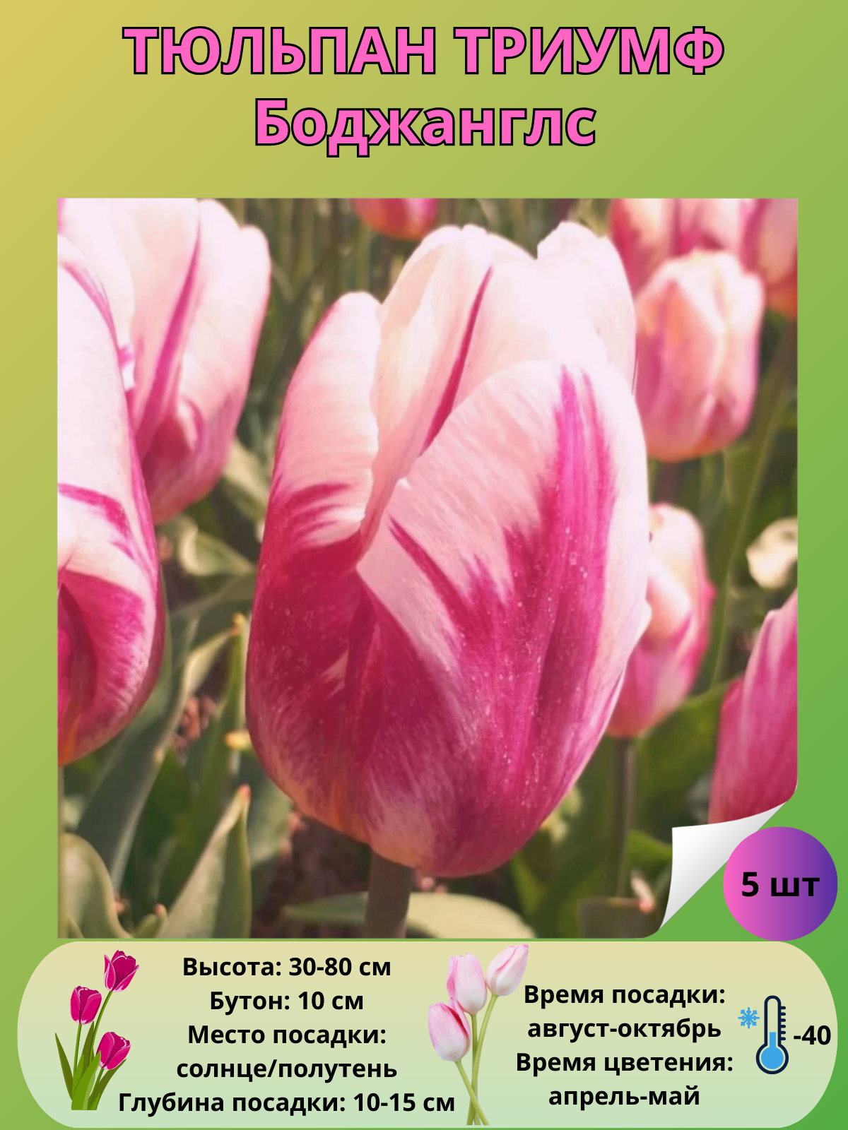 Ниже Вы можете прочитать отзывы на Тюльпан триумф Боджанглс, многолетние цветы, луковицы, ознакомится с подробными характеристиками, посмотреть интересные обзоры и фотографии на Тюльпан триумф Боджанглс, многолетние цветы, луковицы.