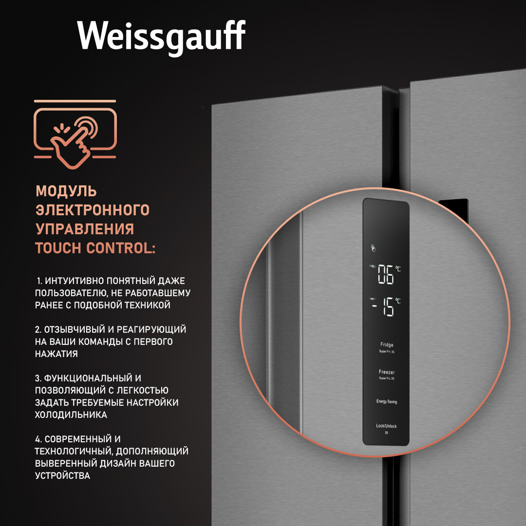 Отдельностоящий холодильник с инвертором Weissgauff WSBS 500 Inverter NoFrost Dark Grey Side by Side двухдверный, 3 года гарантии, Мощность замораживания 12 кг сутки, Сенсорное управление, Цифровой дисплей, LED освещение