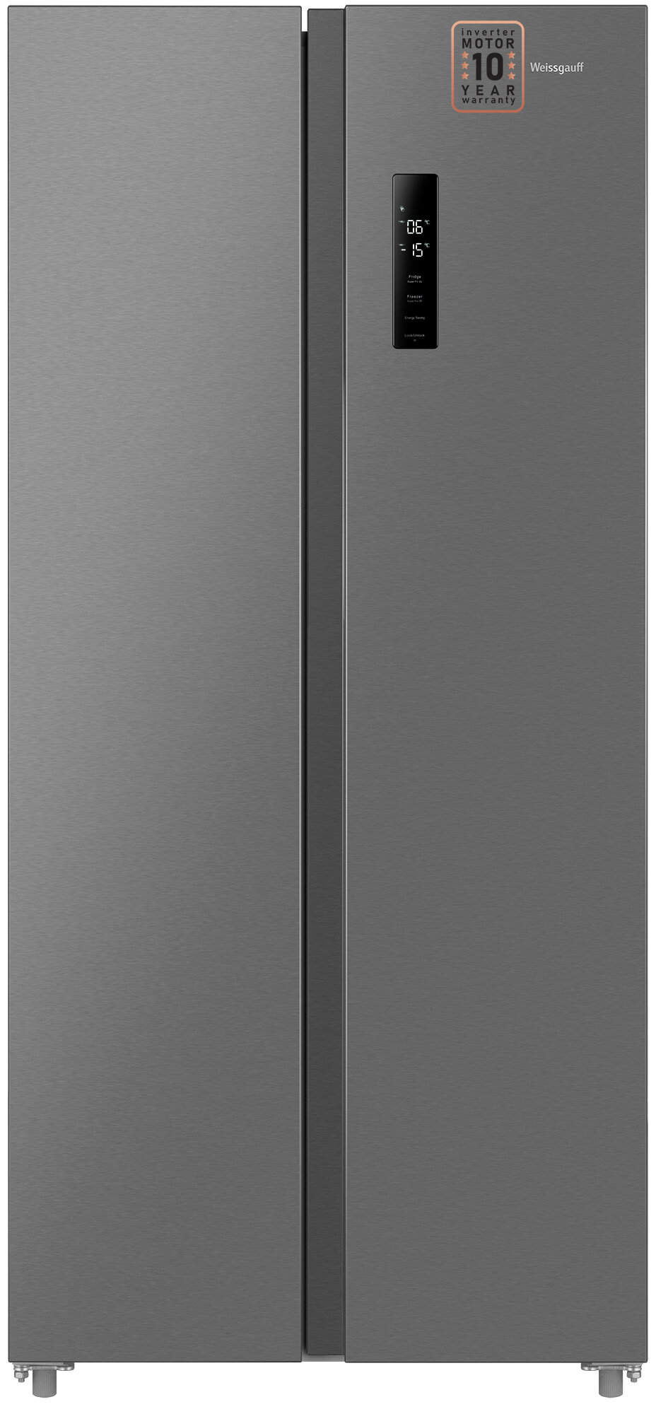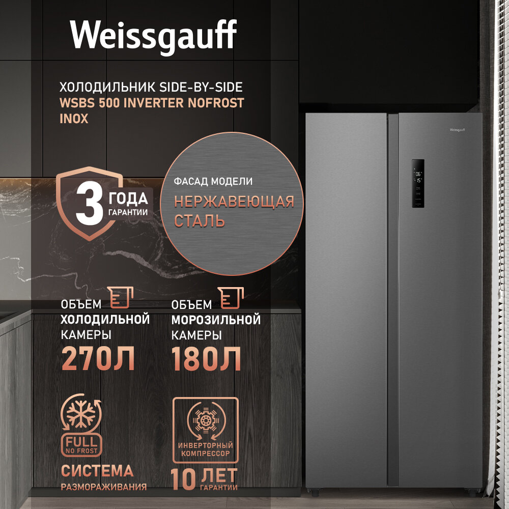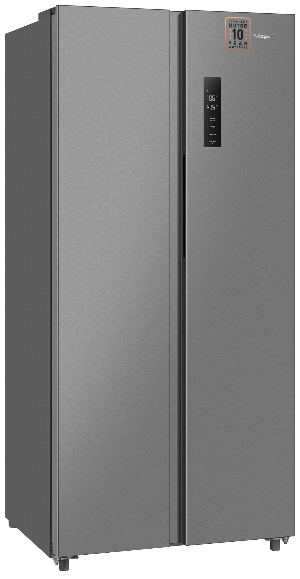 Купить Отдельностоящий холодильник с инвертором Weissgauff WSBS 500 Inverter NoFrost Inox Side by Side двухдверный, 3 года гарантии, Мощность замораживания 12 кг сутки, Сенсорное управление, Цифровой дисплей, LED освещение, Большой общий объём 500 л