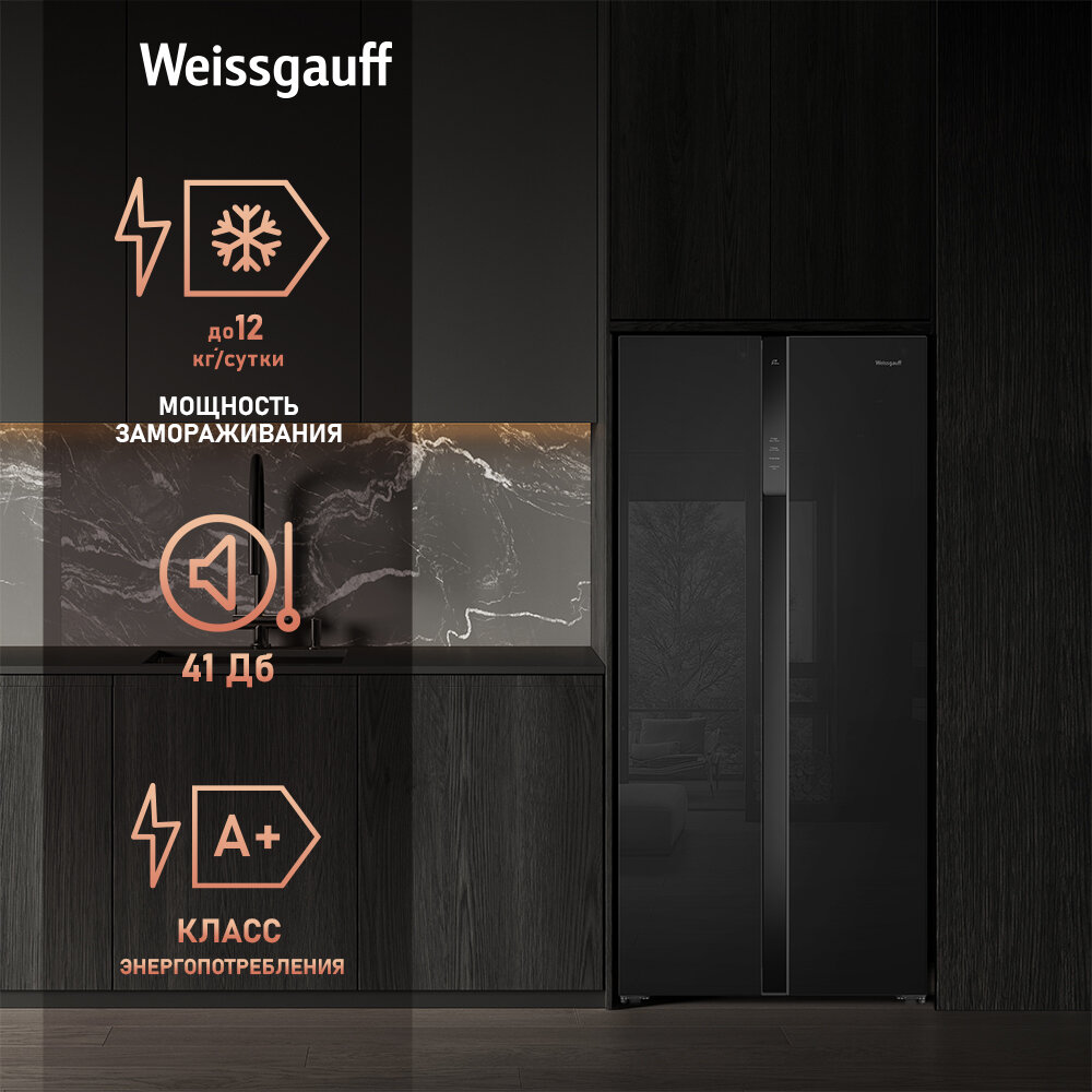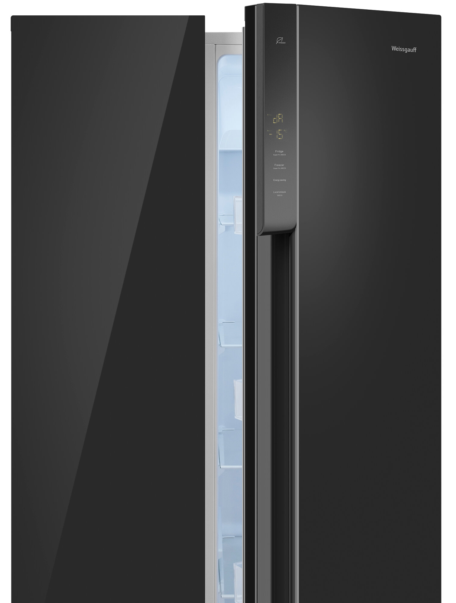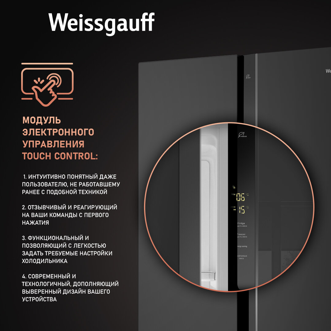 Отдельностоящий холодильник с инвертором Weissgauff WSBS 500 Inverter NoFrost Rock Glass Side by Side двухдверный, 3 года гарантии, Мощность замораживания 12 кг сутки, Сенсорное управление, Цифровой дисплей, Большой общий объём 500 л, Тихий режим работы