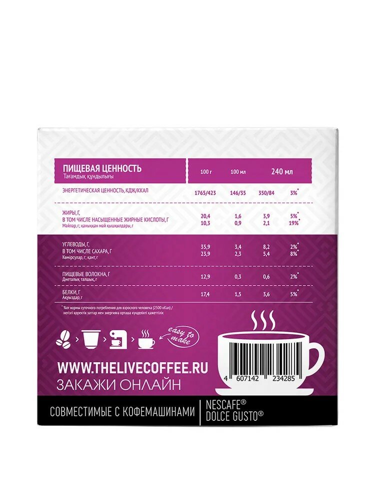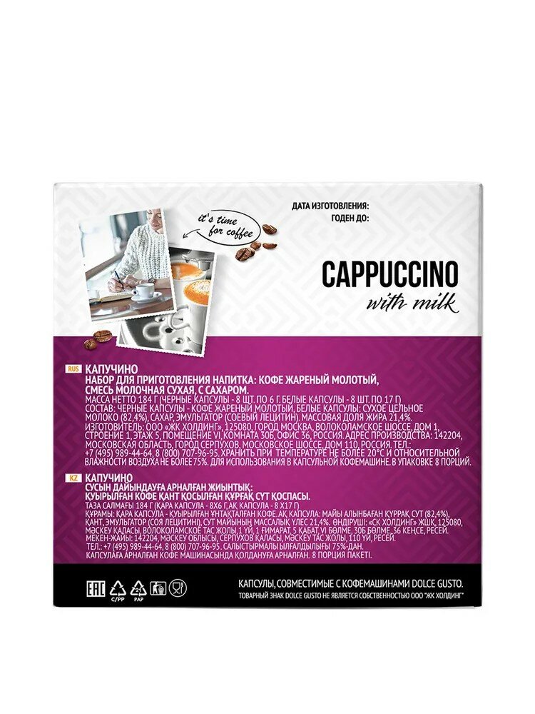 | Состав | черные капсулы: кофе жареный молотый; белые капсулы: сухое цельное молоко (82.4%), сахар, эмульгатор (соевый лецитин) |