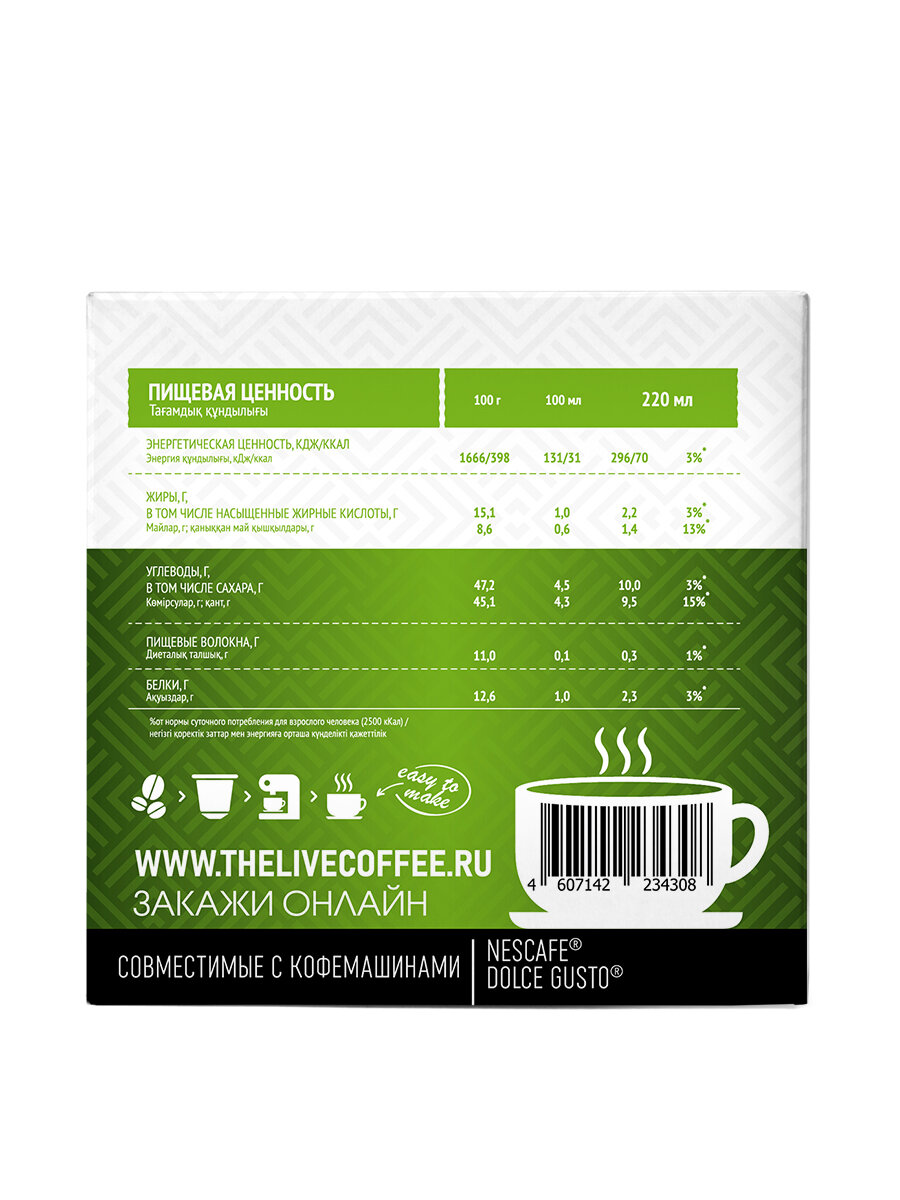 | Состав | черные капсулы - кофе жареный молотый; белые капсулы - молоко сухое цельное (54,4%), сахар (сахароза) (41,9%), ароматизаторы, эмульгатор (соевый лецитин) |