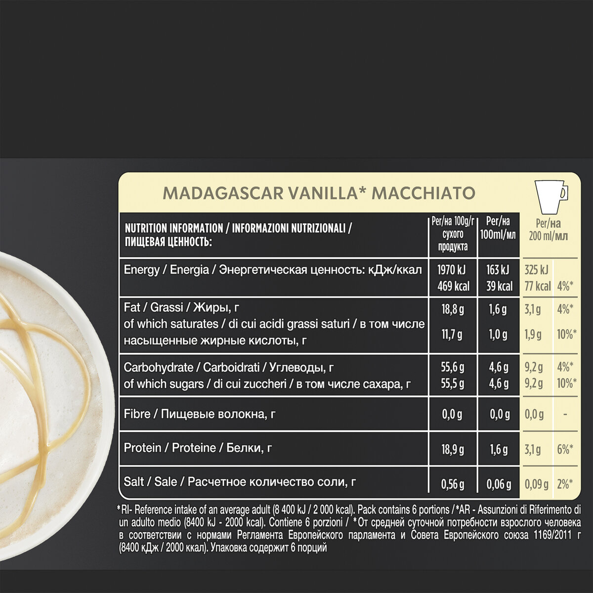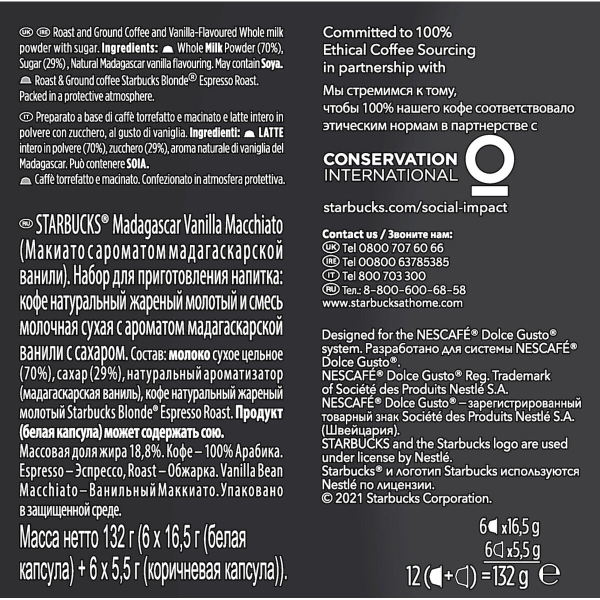 | Состав | Смесь молочная сухая с ароматом мадагаскарской ванили, с сахаром (молоко сухое цельное (70%), сахар (29%), натуральный ароматизатор), кофе натуральный жареный молотый Starbucks Blonde Espresso Roast. Массовая доля жира 18,8%. Продукт (белая капсула) может содержать сою. Кофе – 100% Арабика. |