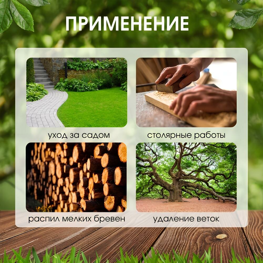 | Особенности конструкции | бесключевая замена оснастки, блокировка кнопки включения, мини-пила, регулировка натяжения цепи без инструмента |