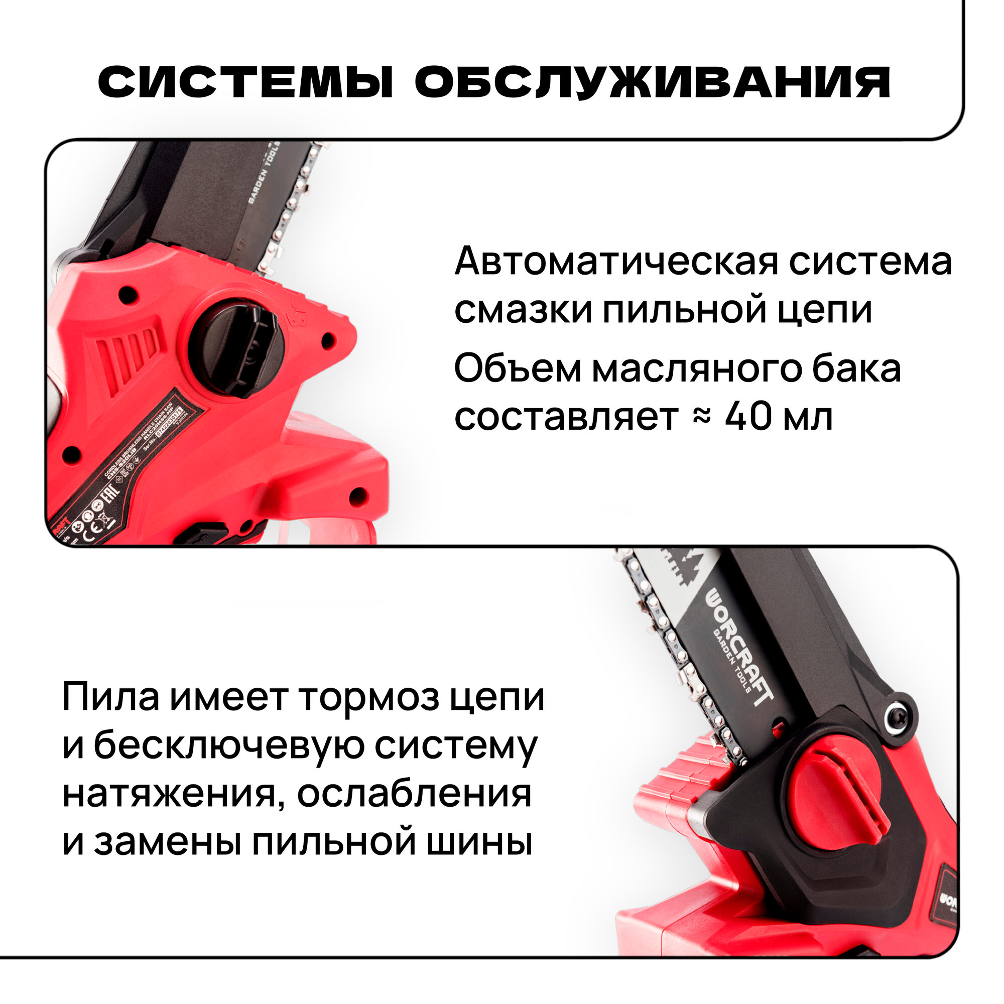 | Особенности конструкции | бесключевая замена оснастки, блокировка кнопки включения, мини-пила, прорезиненная рукоять, регулировка натяжения цепи без инструмента |