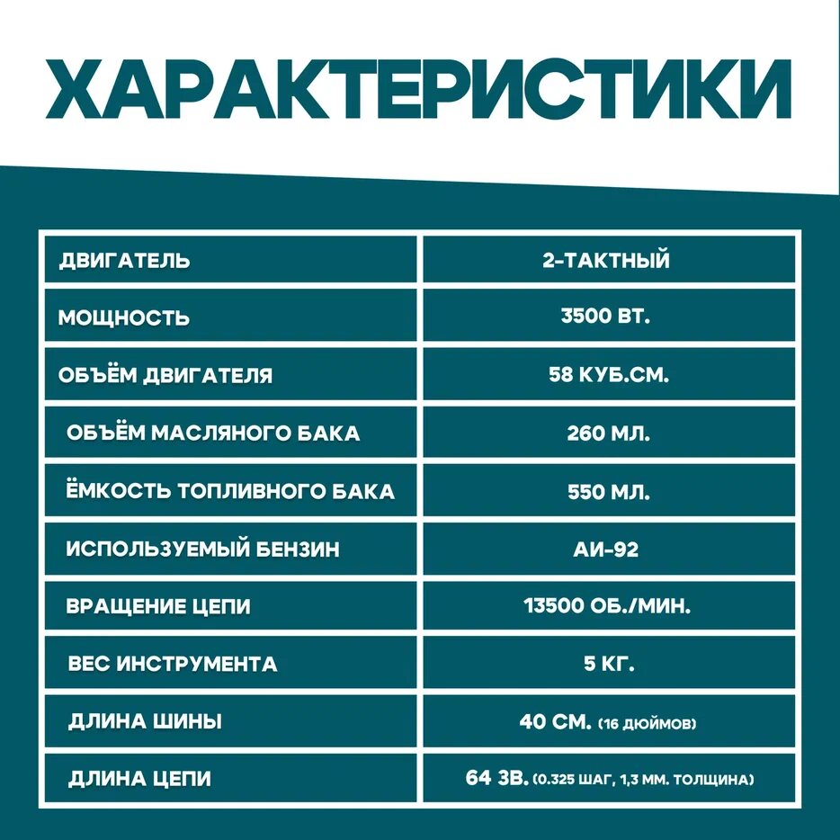 | Комплект поставки | Пила бензиновая - 1шт. Шина для пила цепная-1шт. Цепь для бензопилы -1 шт (16 дюймов ,64 звена). Оригинальное масло 2т - 1 литр. Защитный кожух для цепи - 1шт. Набор ключей - 1шт. Устройство для заточки цепи бензопилы напильник-1 шт |
