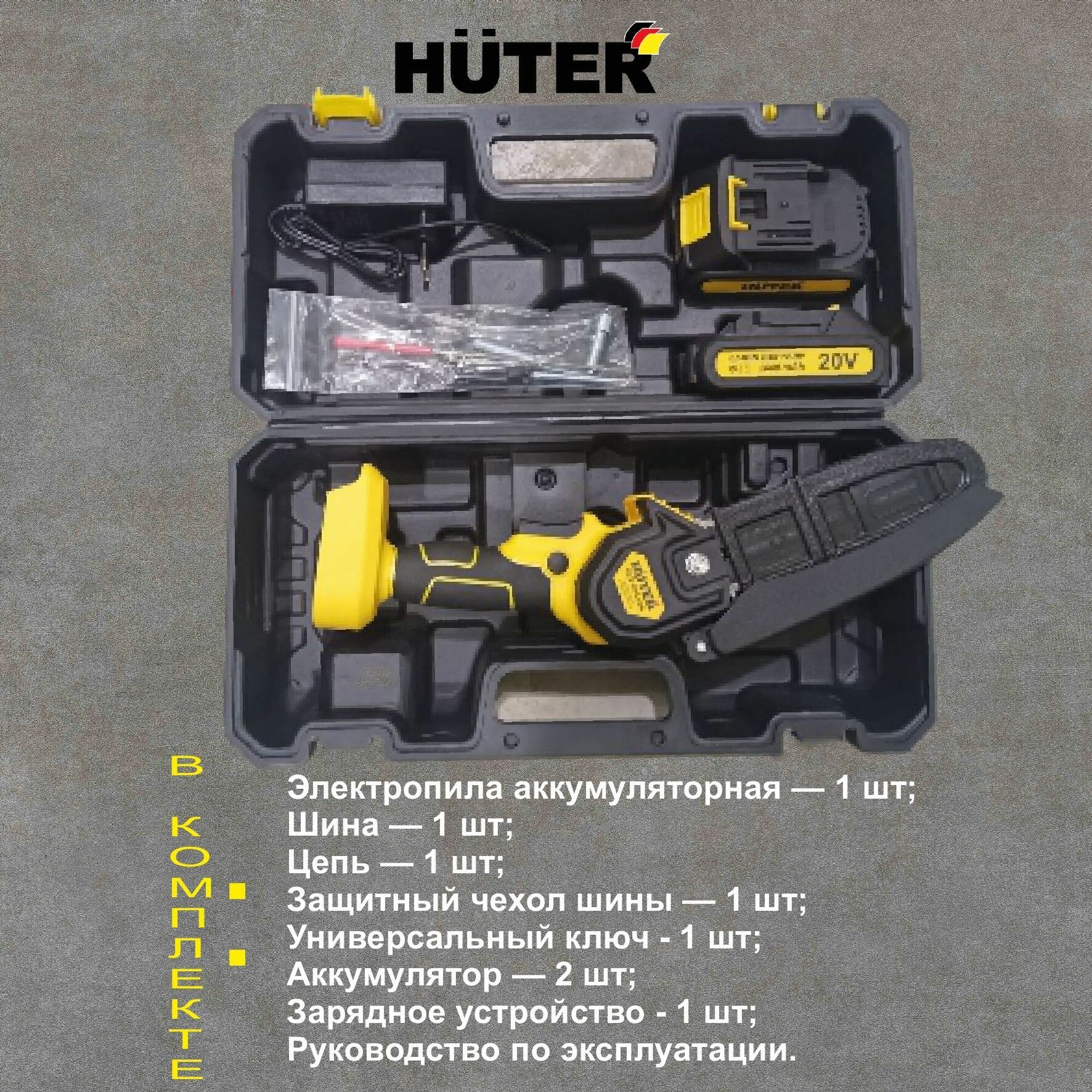 | Комплект поставки | Электропила аккумуляторная — 1 шт. Шина — 1 шт. Цепь — 1 шт. Защитный чехол шины — 1 шт. Паспорт продукции — 1 шт. Универсальный ключ — 1 шт. Аккумулятор – 2шт. Зарядное устройство – 1шт. |