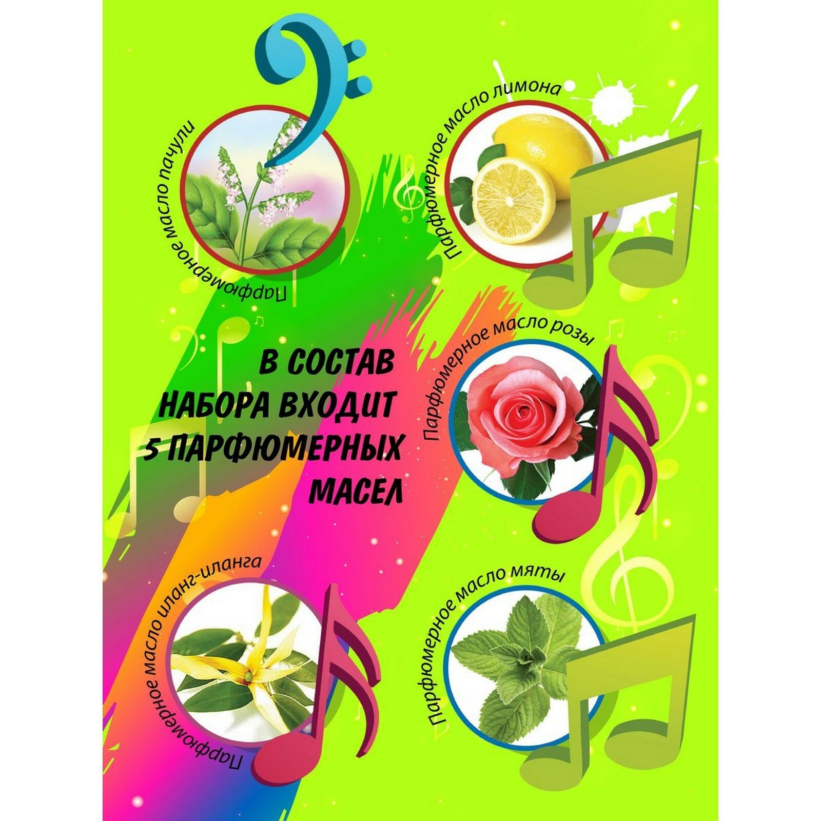 | Состав набора | парфюмерное масло мяты (1 флакон), парфюмерное масло лимона (1 флакон), парфюмерное масло иланг-иланг (1 флакон), парфюмерное масло розы (1 флакон), парфюмерное масло пачули (1 флакон), флакон-спрей, основа для духов (1 флакон), пипетки (5 шт.), стеклянные пробирки (2 шт.), блоттеры, инструкция |