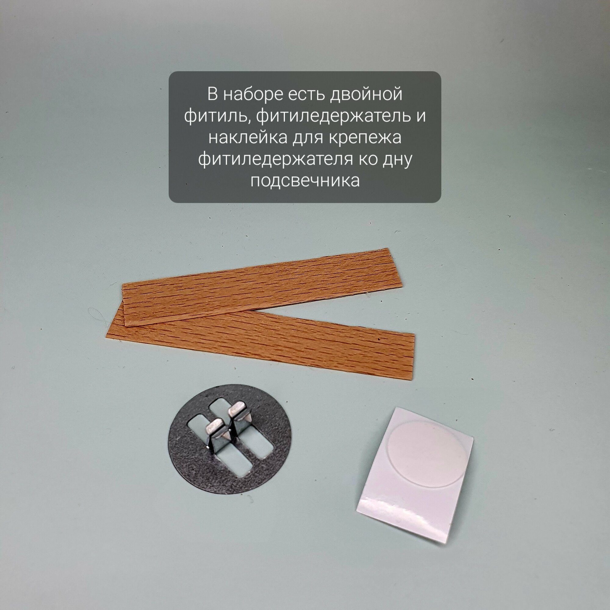 | Комплектация | воск 200г, подсвечники 2шт, подставка 1шт, аромамасло , фитили деревянные 2шт, держатели для фитилей 2шт |