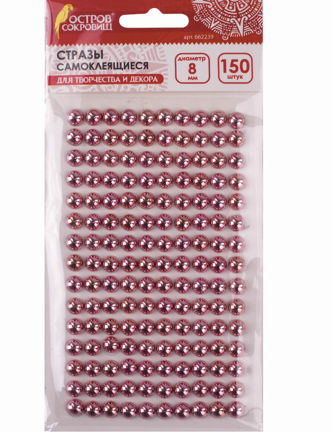 Стразы самоклеящиеся для творчества, рукоделия, аппликаций Круглые, 8 мм, 150 штук, розовые, Остров Сокровищ, 662239