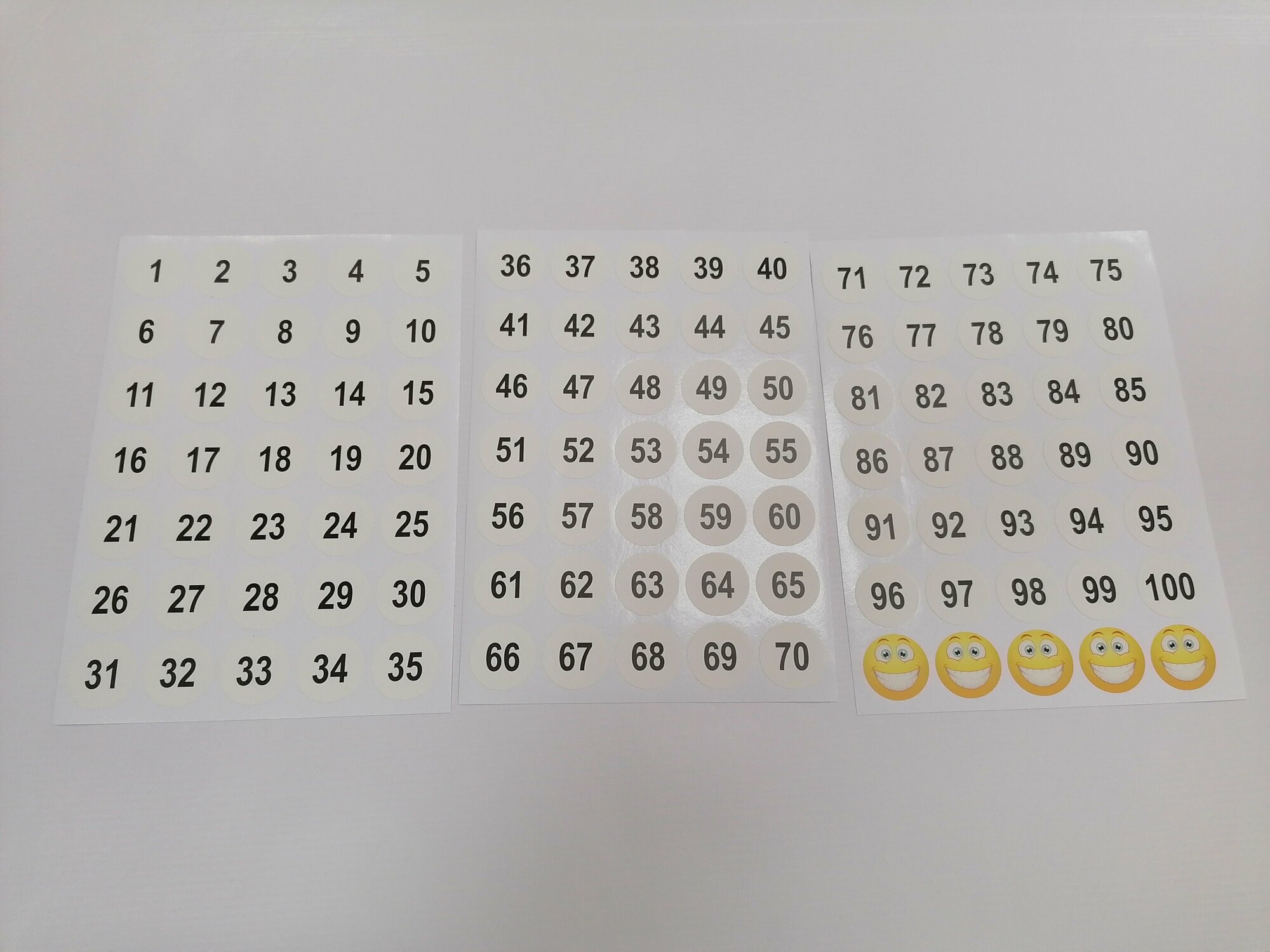 Наклейки (стикеры) "Набор цифр от 1 до 100", диаметр 3 см., белый фон интересное: