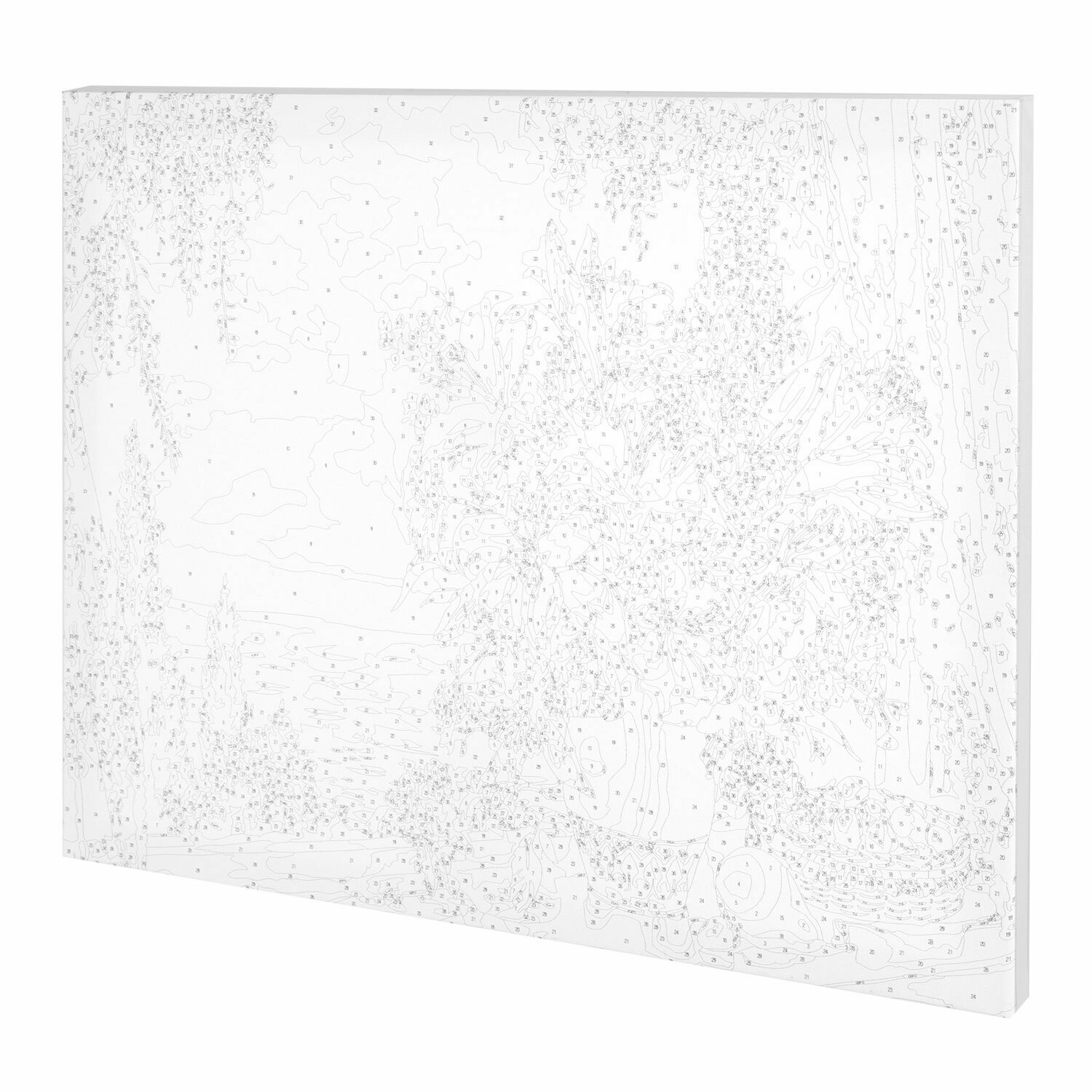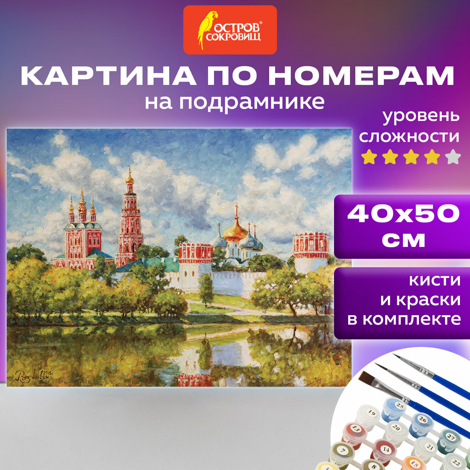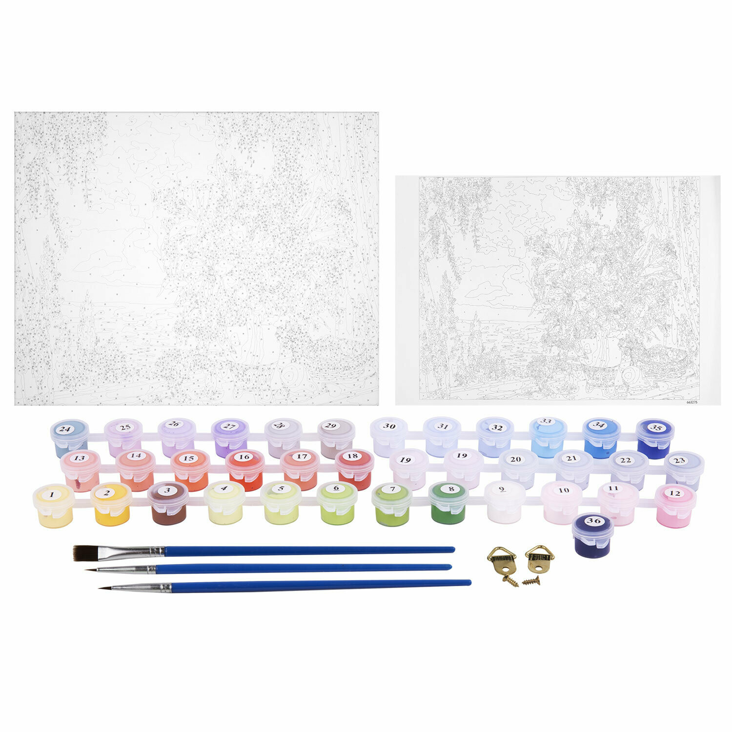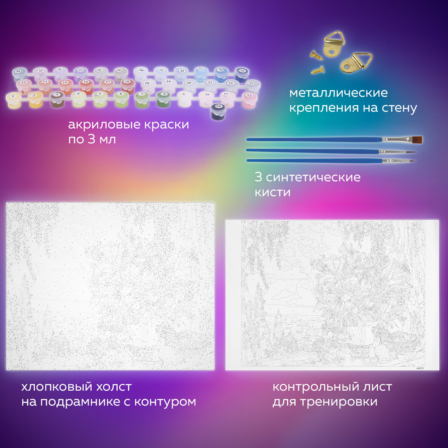 | Комплектация | 1 хлопковый холст на подрамнике с контуром, 1 лист бумаги для тренировки, 26 акриловых красок объемом 3 мл каждая, 3 синтетические кисти и комплект металлических креплений для подвешивания на стену |