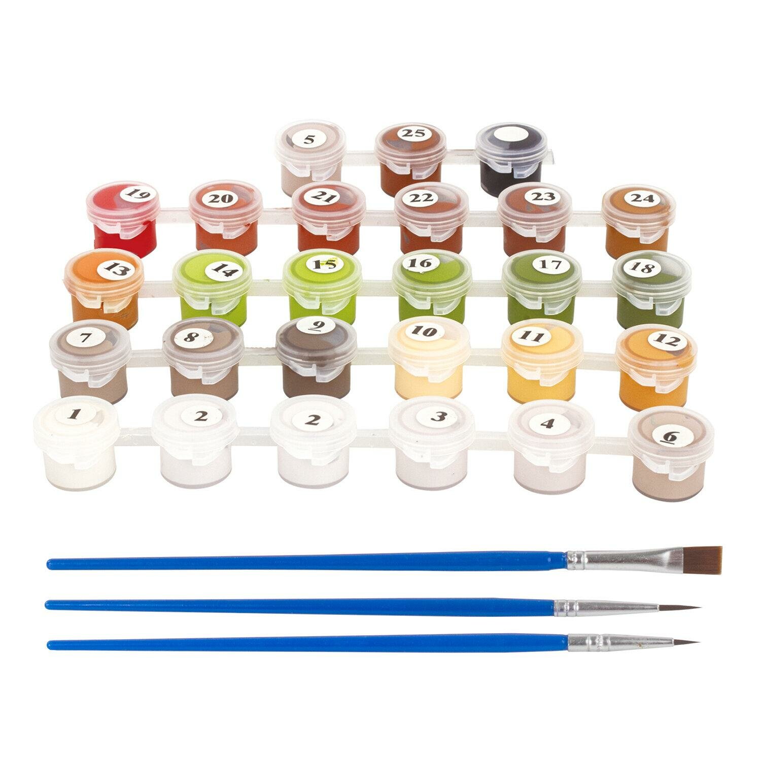 | Комплектация | 1 хлопковый холст на подрамнике с контуром, 1 лист бумаги для тренировки, 26 акриловых красок объемом 3 мл каждая, 3 синтетические кисти и комплект металлических креплений для подвешивания на стену |