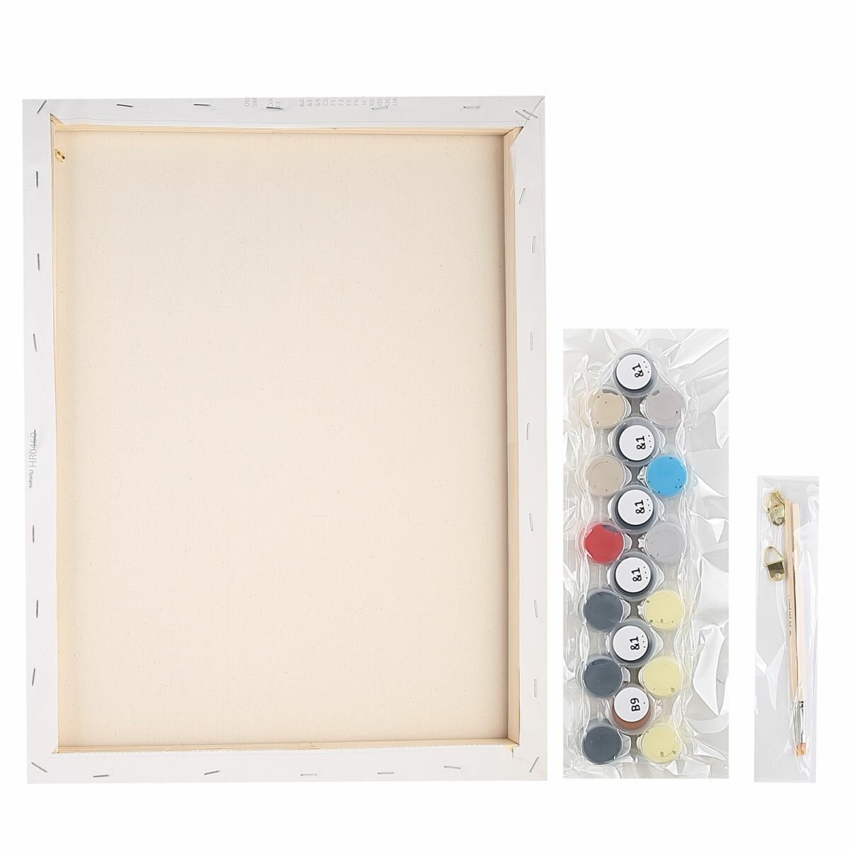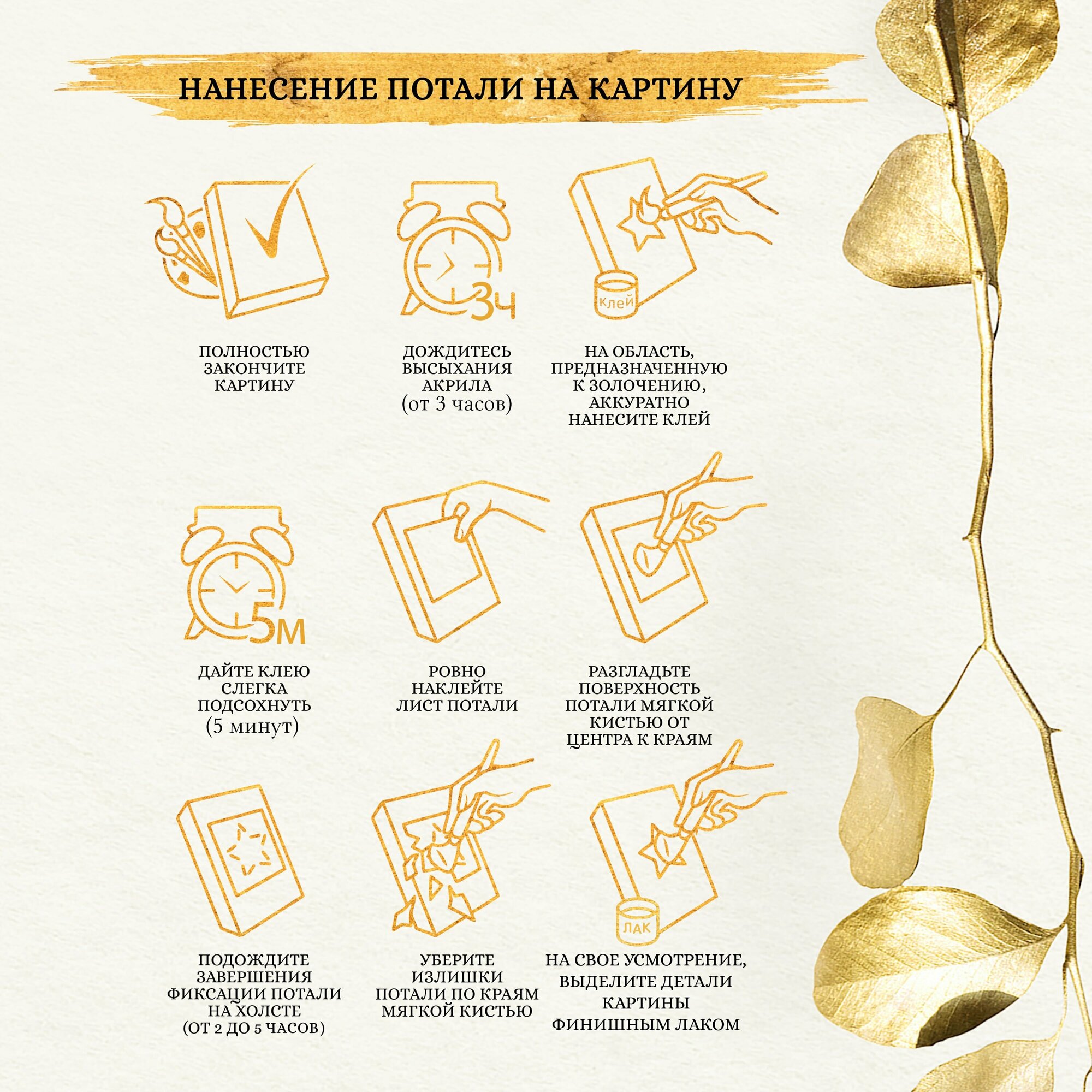 | Комплектация | холст из натурального хлопка на деревянном подрамнике (холст предварительно прогрунтован), 2 нейлоновые кисти разного размера, профессиональные акриловые краски (устойчивые к выцветанию), поталь (5 листов), финишный лак, фиксатор для потали. |