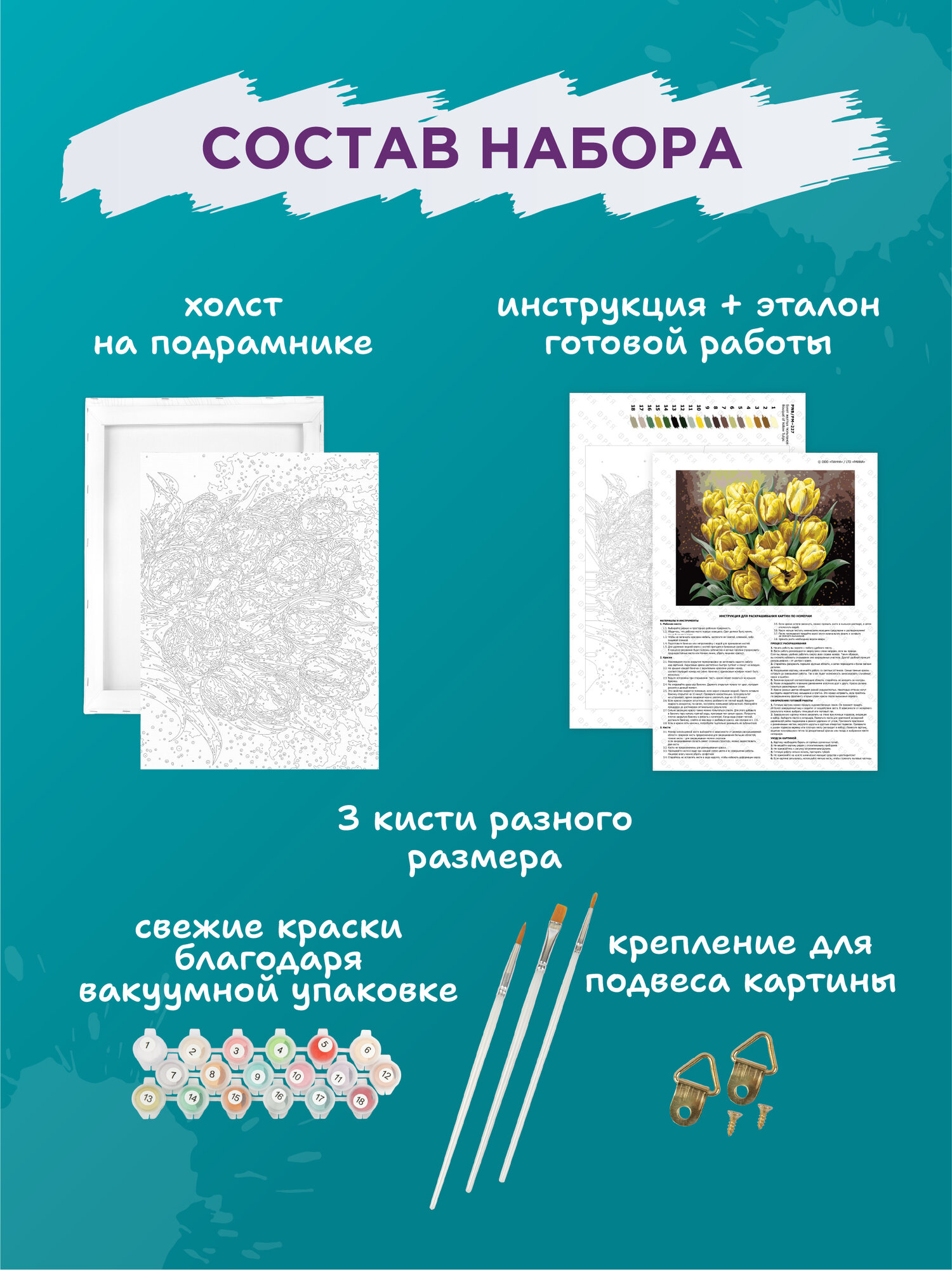 | Особенности | кисти в комплекте / краски в комплекте / репродукция картины |