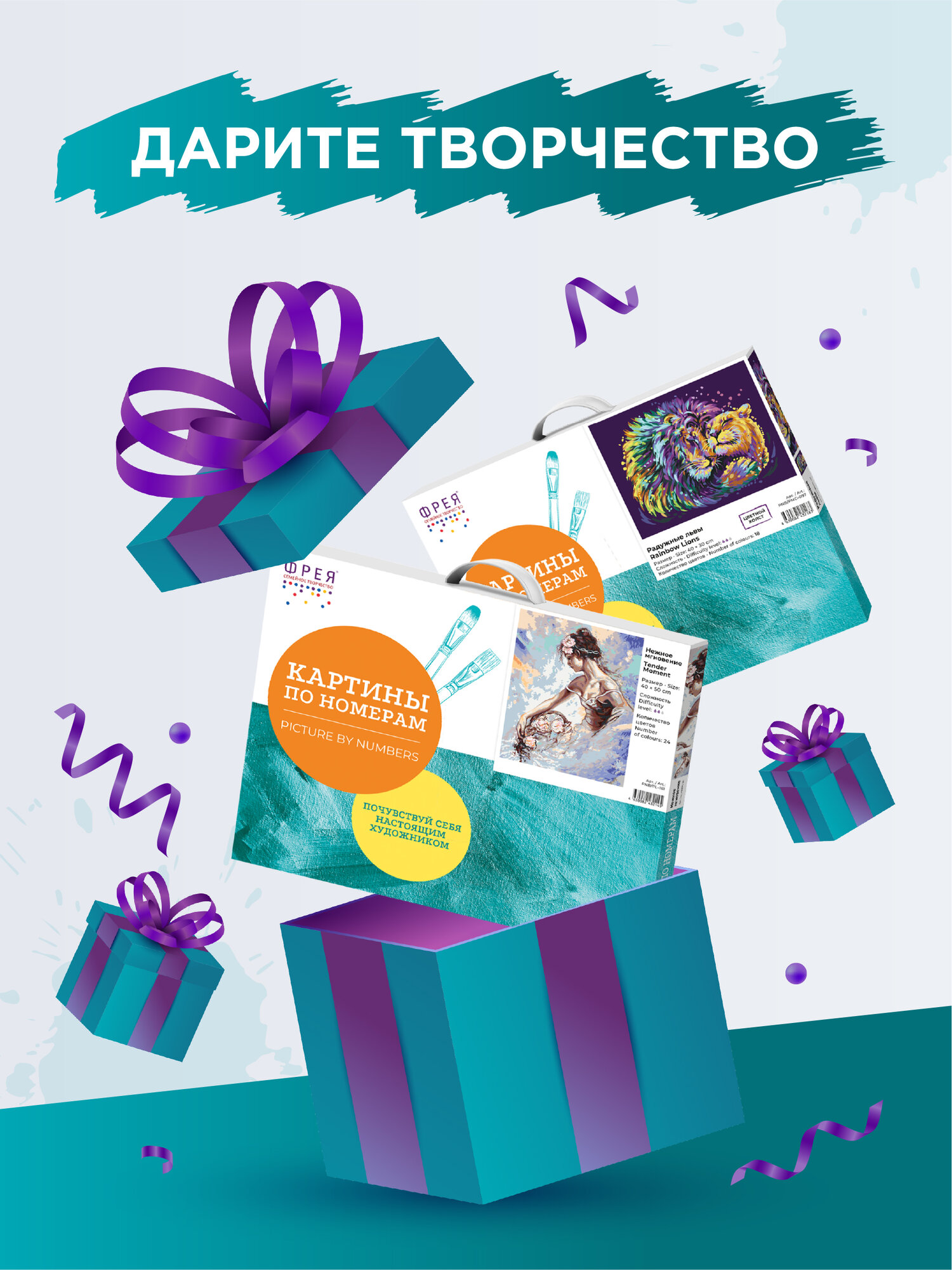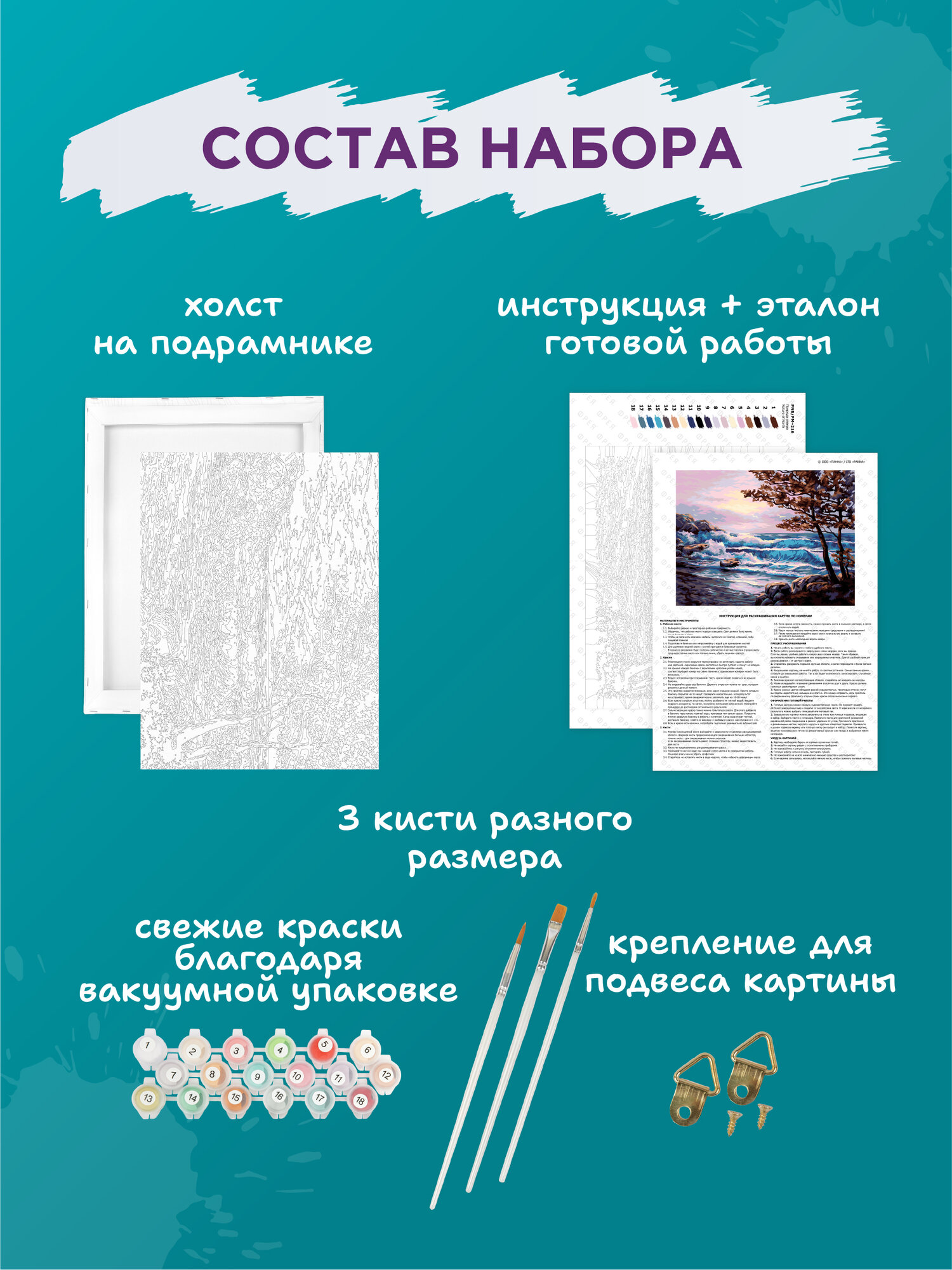 | Комплектация | холст на подрамнике, акриловые краски в пронумерованных баночках, три кисти разного размера, инструкция с контрольным листом и эталоном готовой картины |