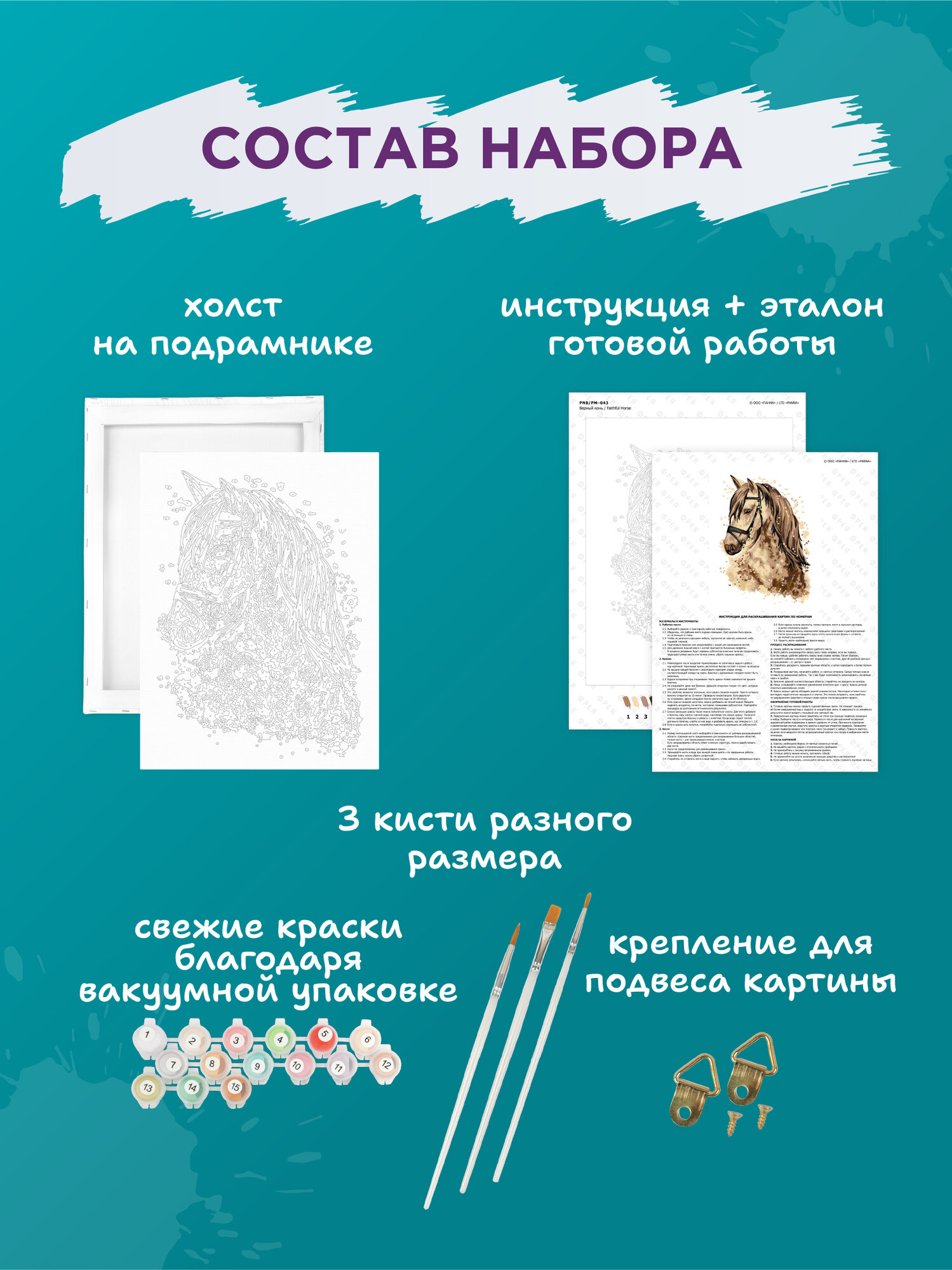 | Особенности | кисти в комплекте / краски в комплекте / репродукция картины |