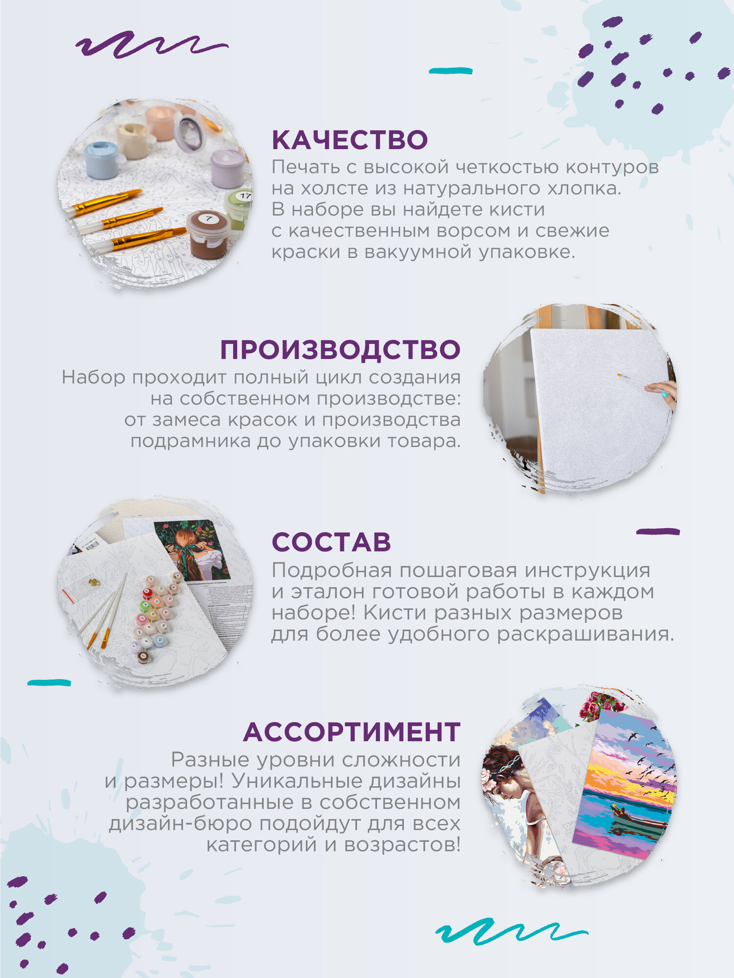 | Комплектация | холст на подрамнике, акриловые краски в пронумерованных баночках, три кисти разного размера, инструкция с контрольным листом и эталоном готовой картины |