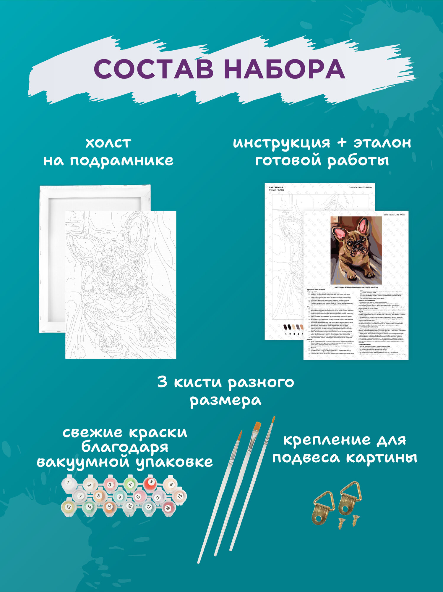 | Особенности | кисти в комплекте / краски в комплекте / репродукция картины |