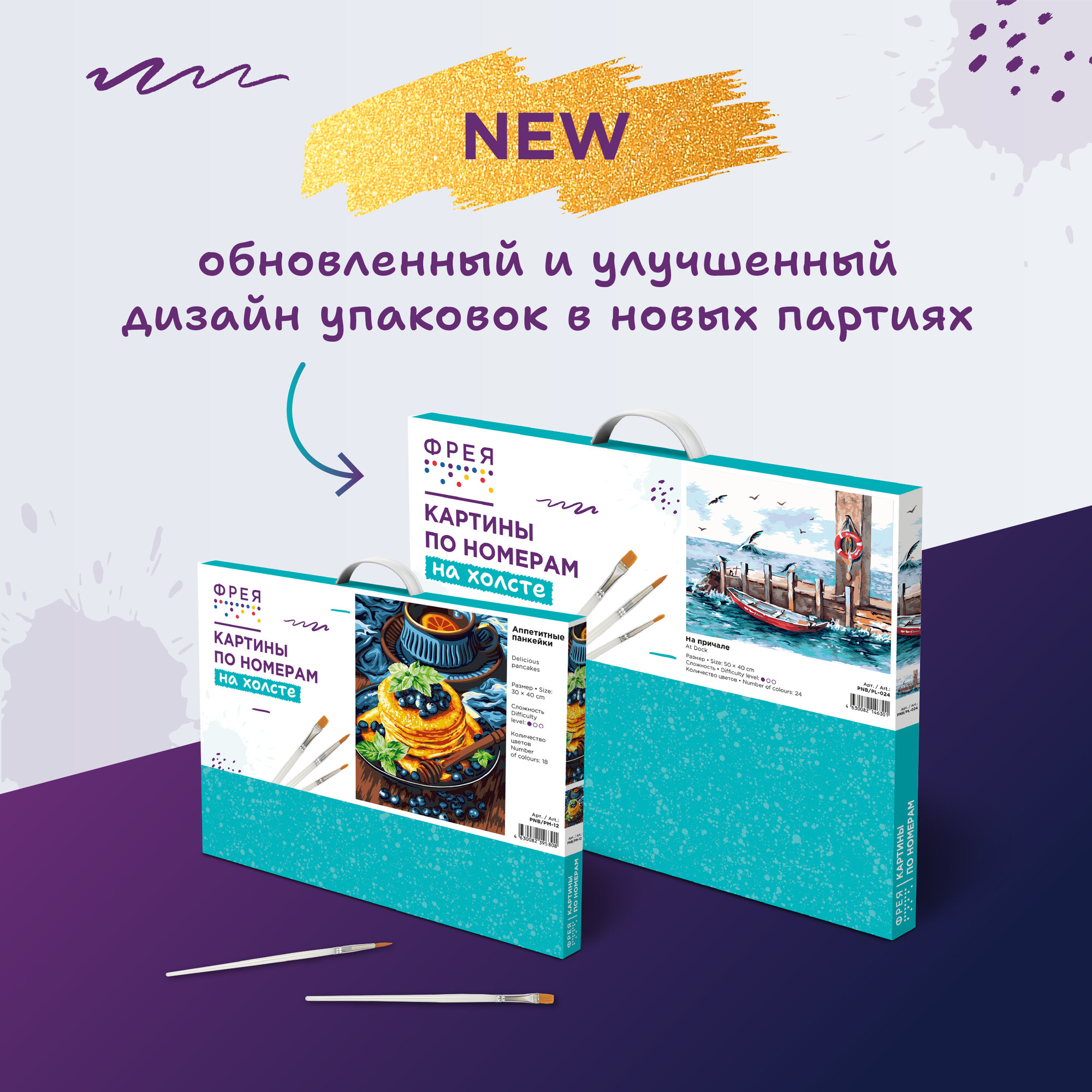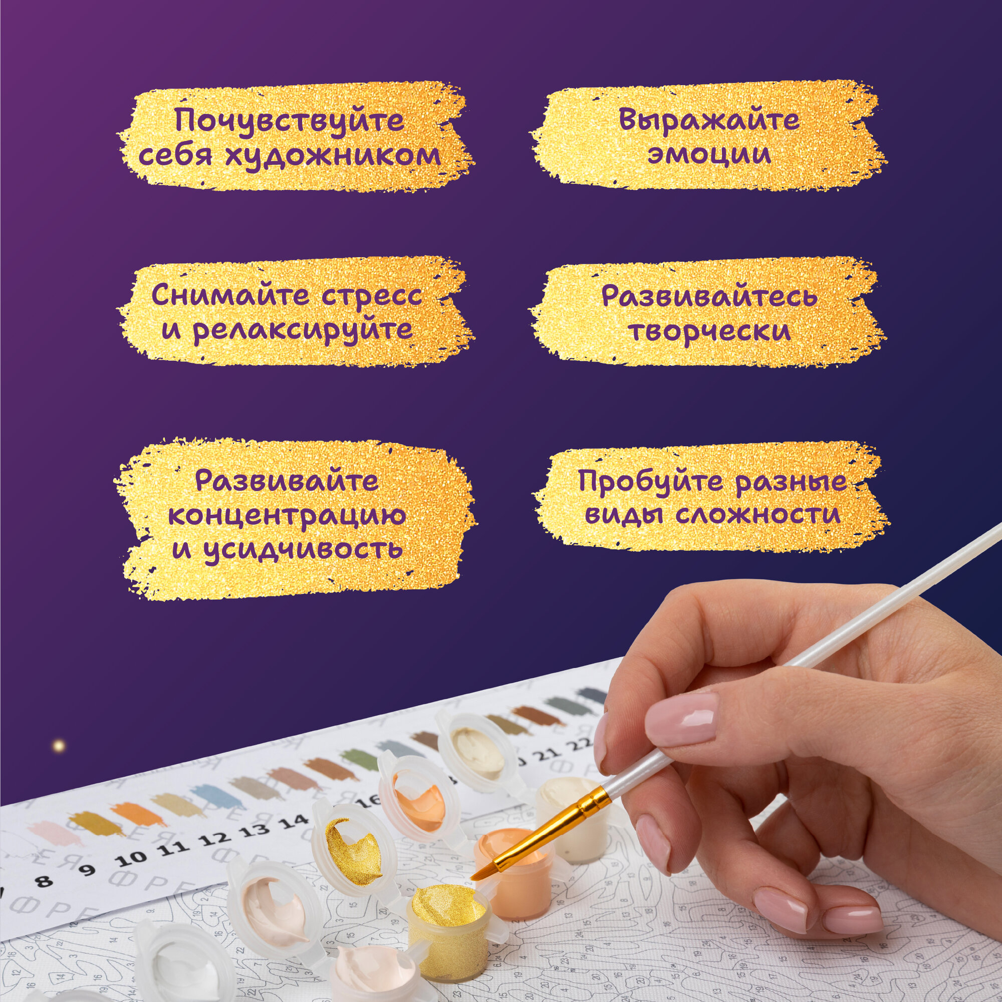 | Комплектация | холст на подрамнике, акриловые краски в пронумерованных баночках, три кисти разного размера, инструкция с контрольным листом и эталоном готовой картины |