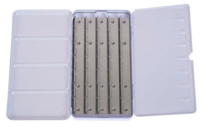 | Дополнительная информация | вмещает 35 кювет, в комплект не входят; держатели соответствуют размерам кювет «Белые ночи»; расстояние между кюветами внутри пенала можно использовать для размещения кистей или аксессуаров; с кольцом для фиксации на пальце |