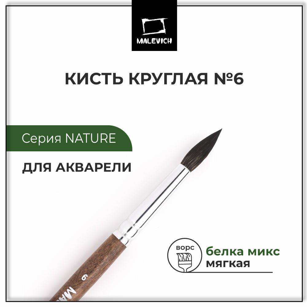 Кисть для акварели "Малевичъ" Nature №6, круглая, из белки и мягкой синтетики